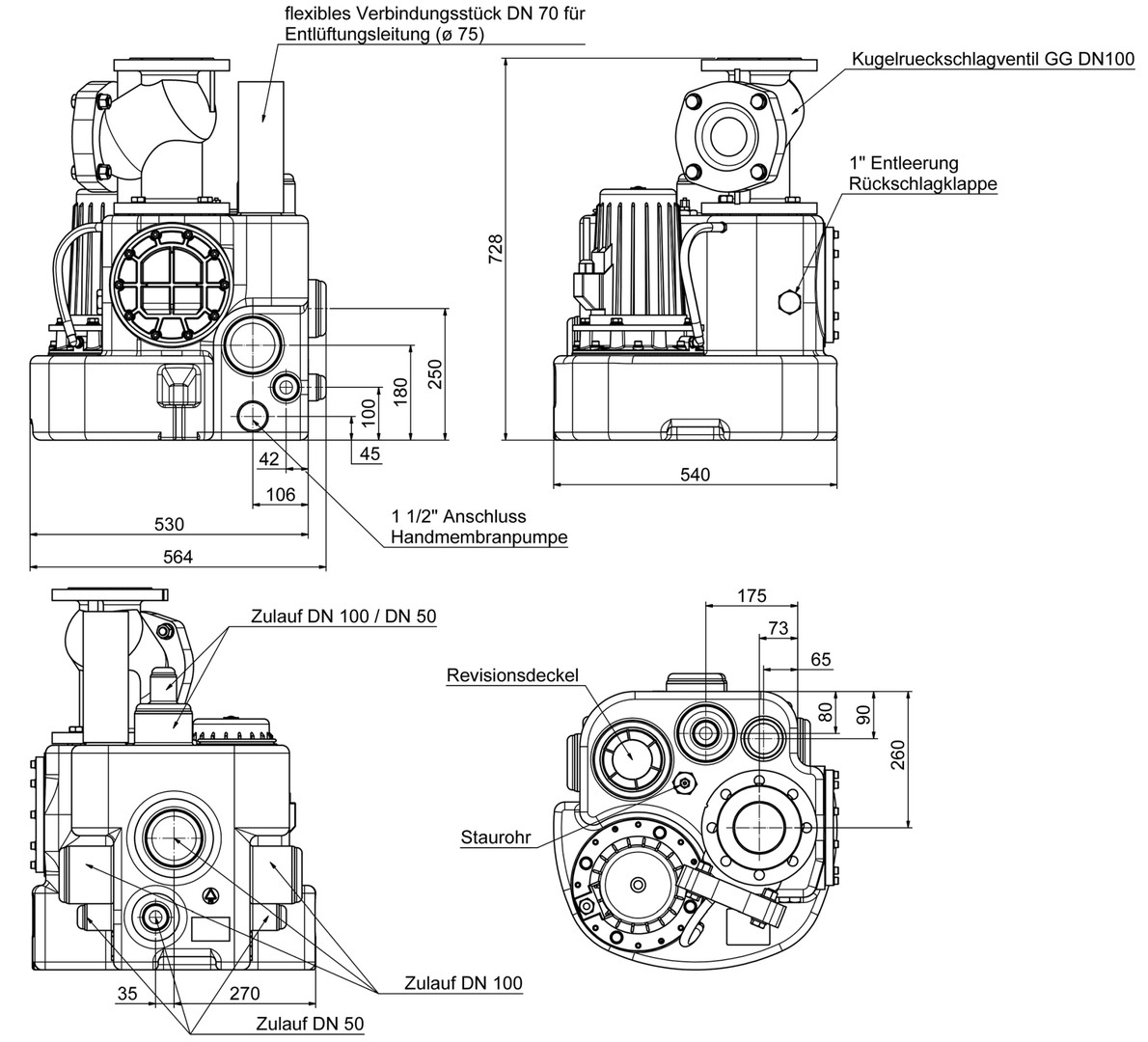 einmotorig, mit Freistromrad, für das Fördern von allen Abwässern aus Einfamilienhäusern, Sanitärobjekten oder kleinen Geschäftsräumen, 7 Einlässe, pneumatisches Steuerterminal ZPS 1 mit akustischem und optischem Alarm, vormontierte Anlage mit Verbindungsstücke und Rückschlagventil, bodenstehend, Schachtöffnung 60 cm
