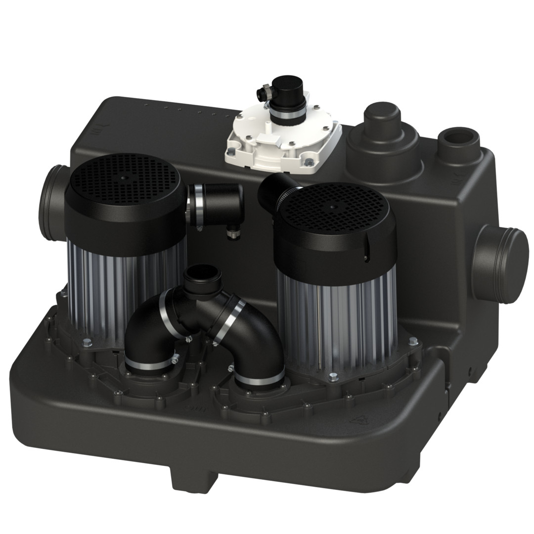 Überflur aufzustellende, für fäkalienhaltige Abwasser aus Ein- und Mehrfamilienhäusern, Wohnungen, kleinen gewerblichen Betrieben, Geschäften oder der Gastronomie, Steuerung pneumatisch durch integrierte Staudruckmessung, Schneidrad Pro X K2, ausgelegt für Medientemperaturen bis 90 °C im Kurzzeitbetrieb (max. 5 Min.), zwei niedrig liegende Einlässe DN 100, bodenstehend, Leistungsaufnahme P1 2500 W, Leistungsabgabe P2 2000 W, Betriebsart S3 40 %, Schutzart IPX8, potentialfreier Kontakt, max. Förderhöhe 18 m, max. Förderleistung 19 cbm/h, Durchmesser Einlass (außen) 100 mm, Druckleitungsdurchmesser (außen) 50 mm, Außendurchmesser Be- und Entlüftung 50 mm, Gesamtvolumen 39 l, Nutzvolumen 15 l, Niveau Einschalthöhe / Niveau Ausschalthöhe 155 / 60 mm, Füllstandsalarm 225 mm, mit externer Steuereinheit und Alarmsystem