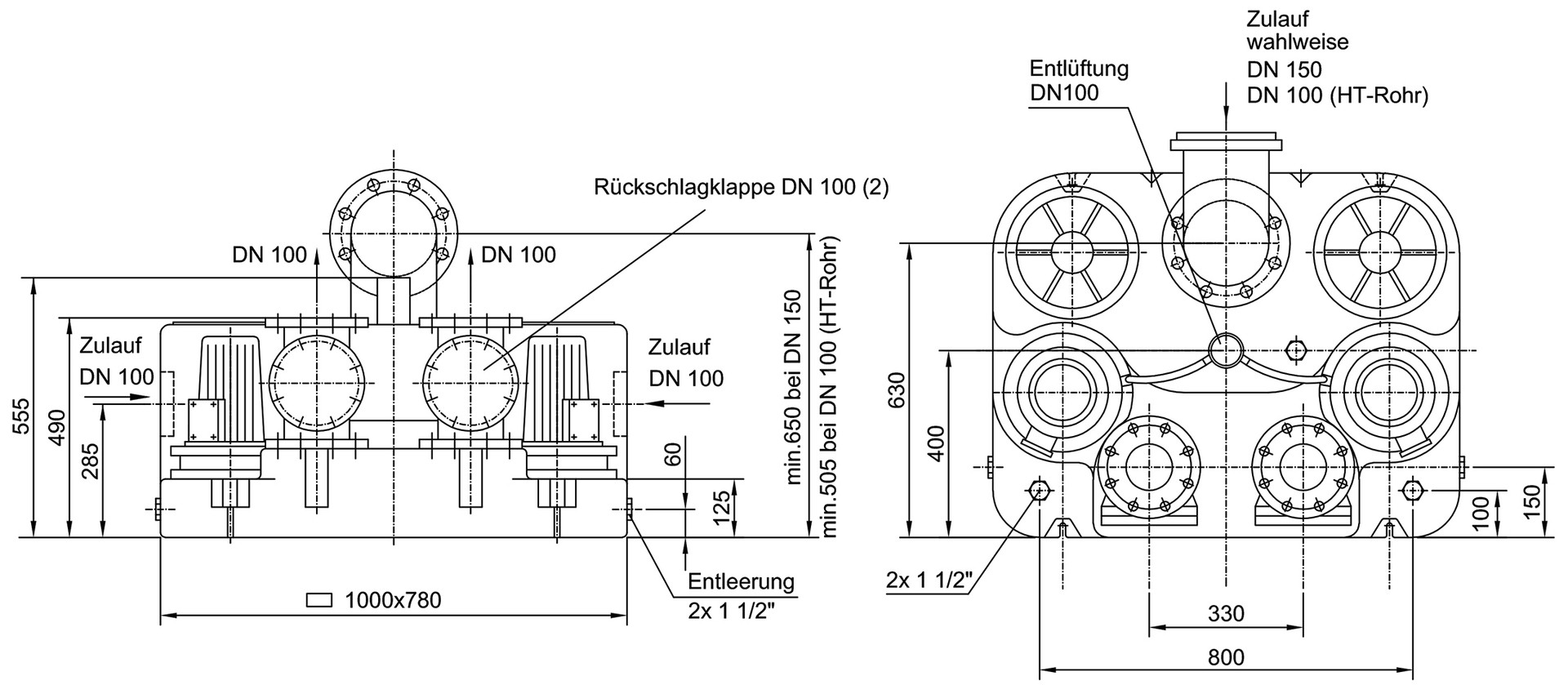 zweimotorig, mit Freistromräder, zur Entsorgen häuslicher Abwässer aus Mehrfamilienhäusern, Sanitärobjekten oder gwerblichen Einrichtungen wo die Abwasserentsorgung nicht unterbrochen werden darf, zwei Freistromradpumpen, Installation überflur in frostgeschützten Räumen unterhalb der Rückstauebene, pneumatisches Steuerterminal ZPS 2 mit akustischem und optischem Alarm, mit zwei Rückstauklappen, ein Hosenrohr und ein Übergangsstück, Spannung 400 V, Betriebsart S3 25%, max. Förderleistung 40 bzw 60 cbm/h, Durchmesser Einlass DN 100/150, Druckleitungsdurchmesser DN 100, Außendurchmeser Be- und Entlüftung DN 100, Gesamtvolumen 200 l, Nutzvolumen 100 l, freier Durchgang 50 mm, Tmax. der gepumpten Flüssigkeit (kurzzeitig, max. 5 Min.) 55 °C, Schaltungsart pneumatisch