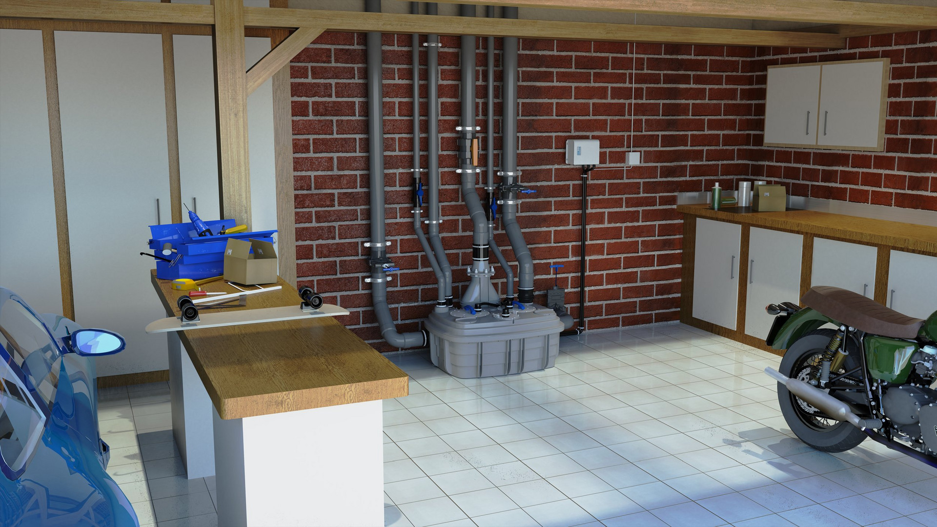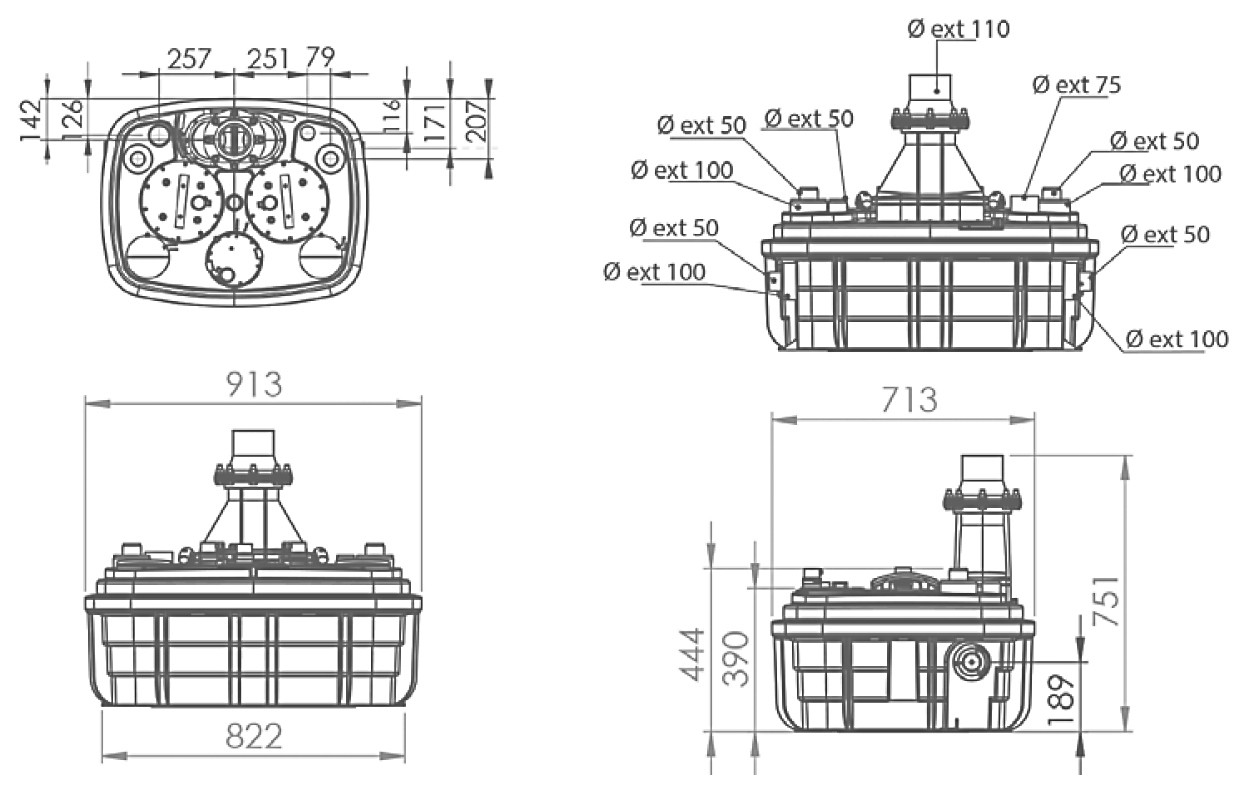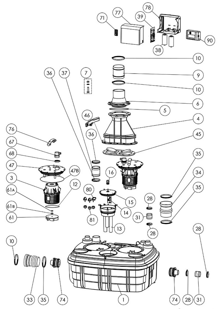zwei Freistromradpumpen mit freien Durchgang von 50 mm, fördert bis zu 55 qm Grau- und Schwarzwasser pro Stunde, 5 Einlässe, obenliegende und seitliche Einlässe DN 40 -110, mit kabelgebundenen Alarmsystem, Spannung 220 - 240 V, Leistungsaufnahme P1 2000 W, Leistungsaufnahme P2 1400 W, Betriebsart, S3 30%, Schutzart IP68, potentialfreier Kontakt, max. Förderhöhe 13 m, max Förderleistung 40 cbm/h, Durchmesser Einlass (außen) 40/50/100/110 mm, Druckleitungsdurchmesser (außen) 90/110 mm, Außendurchmesser Be- und Entlüftung 75 mm, Gesamtvolumen 120 l, Nutzvolumen, 26 l, Niveau Einschalthöhe / Niveau Ausschalthöhe 165/95 mm, Füllstandsalarm 235 mm, freier Durchgang 50 mm, Tmax. der gepumpten Flüssigkeit (kurzzeitig, max. 5 Min.) 70 °C, Schaltungsart pneumatisch