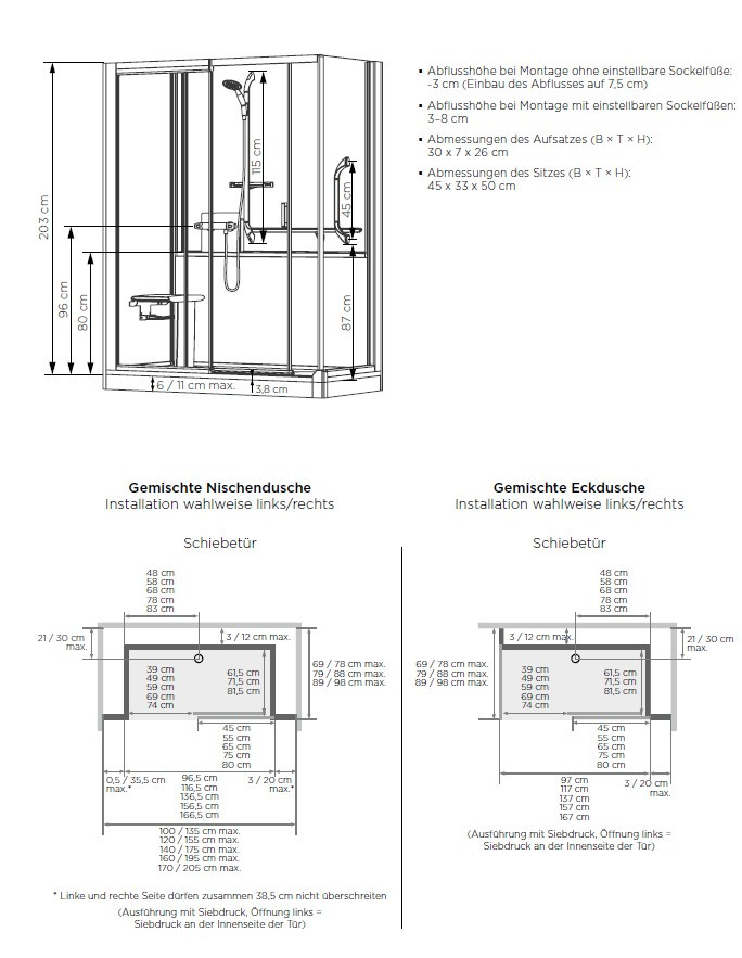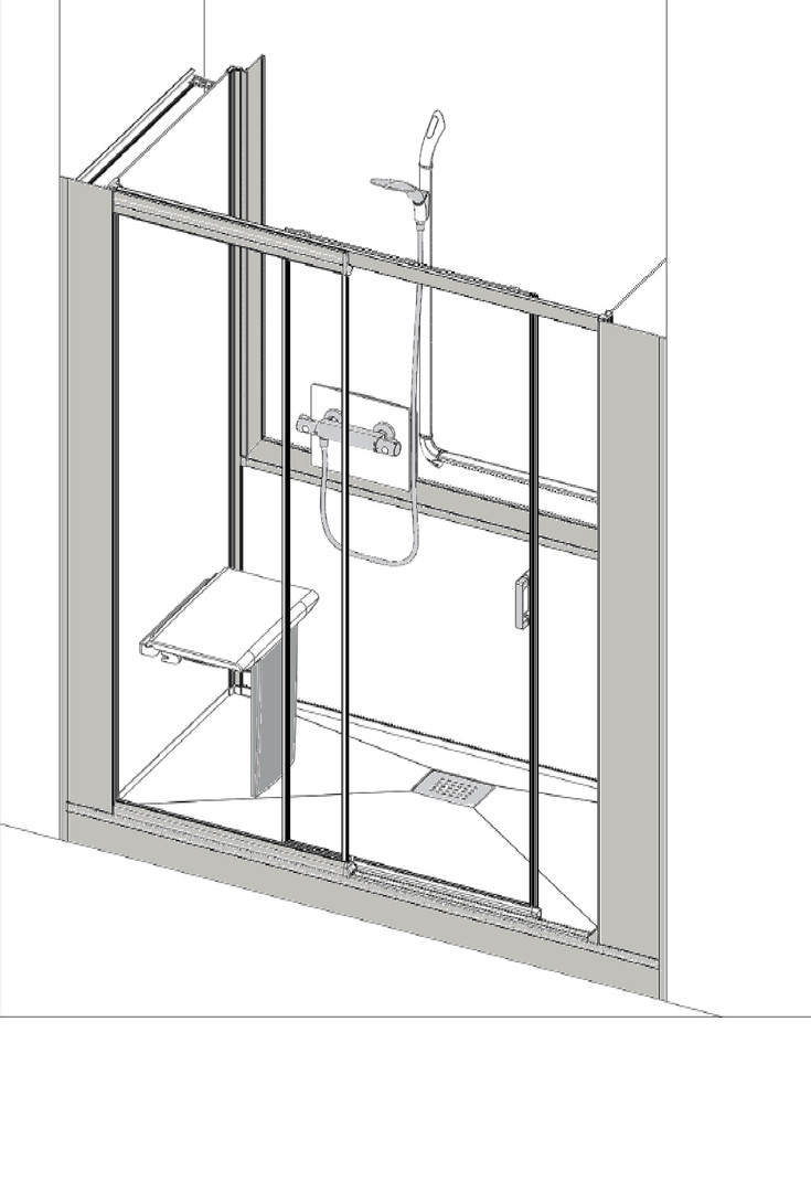 SFA Kinedo Kinemagic Royal Plus 100x70 gemischte Nischenversion halbhohe Rückwand Schiebetür Klappsitz Einhebelmischer Relinggriffsystem mit Magnethandbrause Klarglas mit mattiertem Mittelstreifen und Antikalkbehandlung Duschwanne PN24 6mm Sicherheitsglas