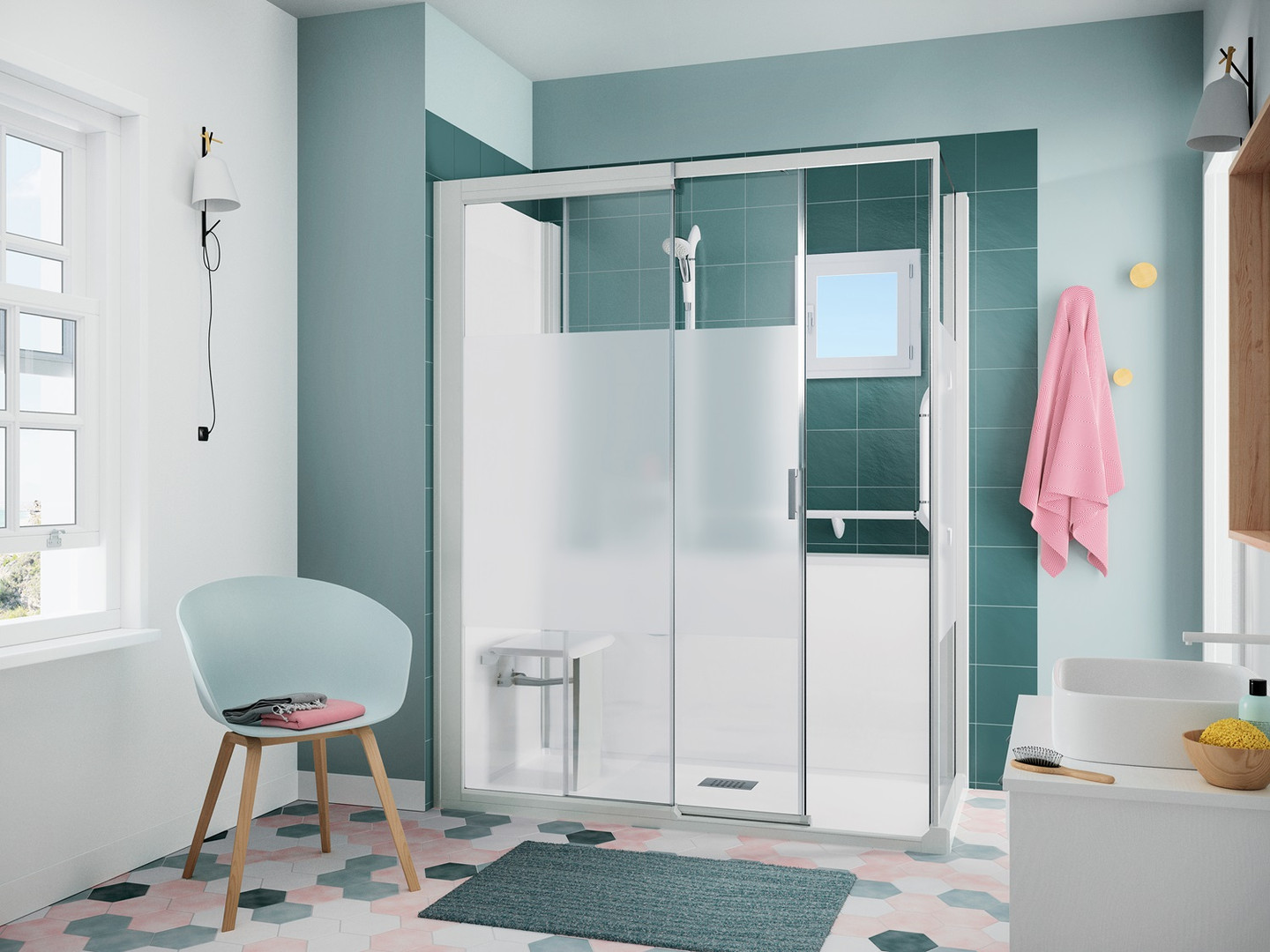 SFA Kinedo Kinemagic Royal Plus 100x90 gemischte Eckausführung halbhohe Rückwand Schiebetür Klappsitz Einhebelmischer Relinggriffsystem mit Magnethandbrause Klarglas mit mattiertem Mittelstreifen und Antikalkbehandlung Duschwanne PN24 6mm Sicherheitsglas