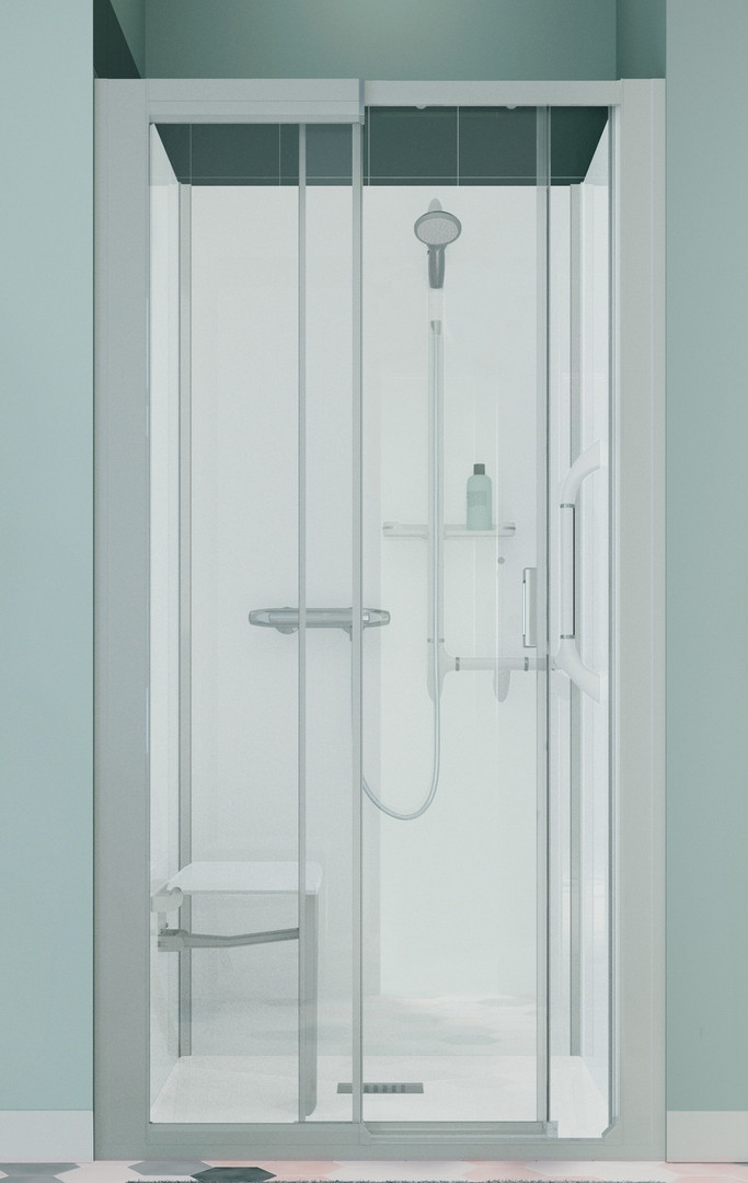 SFA Kinedo Kinemagic Royal Plus 120x80 hohe Nischenausführung mit Schiebetür Klappsitz Einhebelmischer Relinggriffsystem mit Magnethandbrause Klarglas mit mattiertem Mittelstreifen und Antikalkbehandlung Duschwanne PN24 6mm Sicherheitsglas