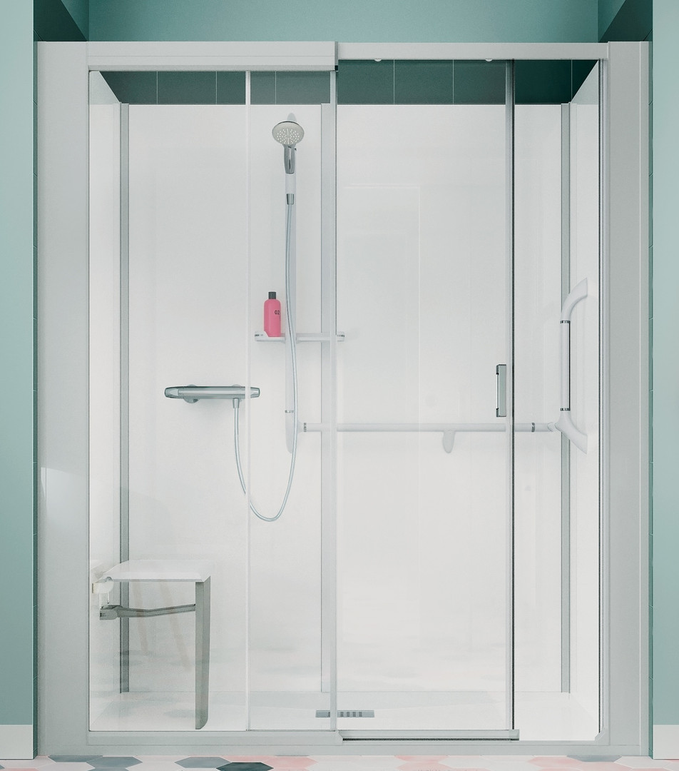 SFA Kinedo Kinemagic Royal Plus 140x70 hohe Nischenausführung mit Schiebetür Klappsitz Thermostatarmatur Relinggriffsystem mit Magnethandbrause Klarglas mit mattiertem Mittelstreifen und Antikalkbehandlung Duschwanne PN24 6mm Sicherheitsglas