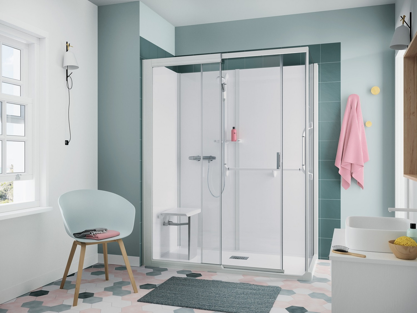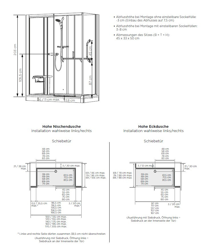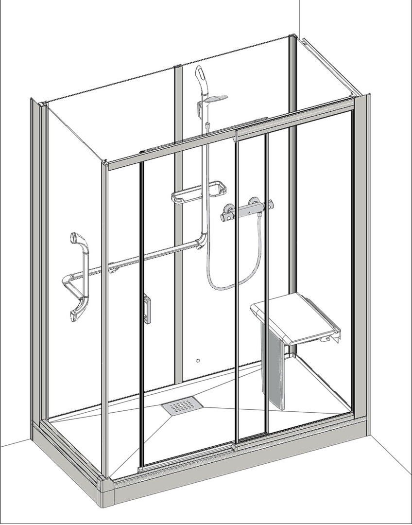 SFA Kinedo Kinemagic Royal Plus 140x80 hohe Eckausführung mit Schiebetür Klappsitz Einhebelmischer Relinggriffsystem mit Magnethandbrause Klarglas mit mattiertem Mittelstreifen und Antikalkbehandlung Duschwanne PN24 6mm Sicherheitsglas