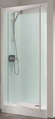 SFA Kinedo Kineprime Glass Komplettdusche 80x80 Nischenausführung mit Drehtür Thermostatarmatur und Brausestange mit Handbrause Rückwände Opakglas weiß, Drehtür Klarglas Duschwannenhöhe 9cm Höhe 199cm Einstiegsbreite 60cm