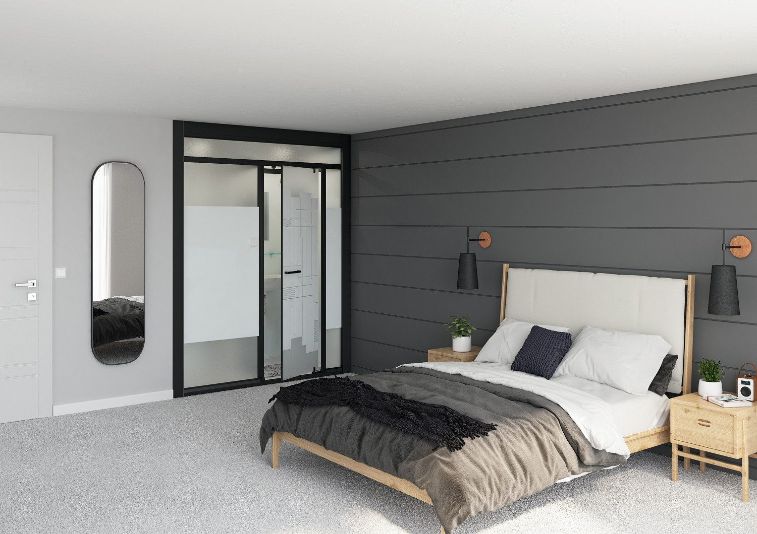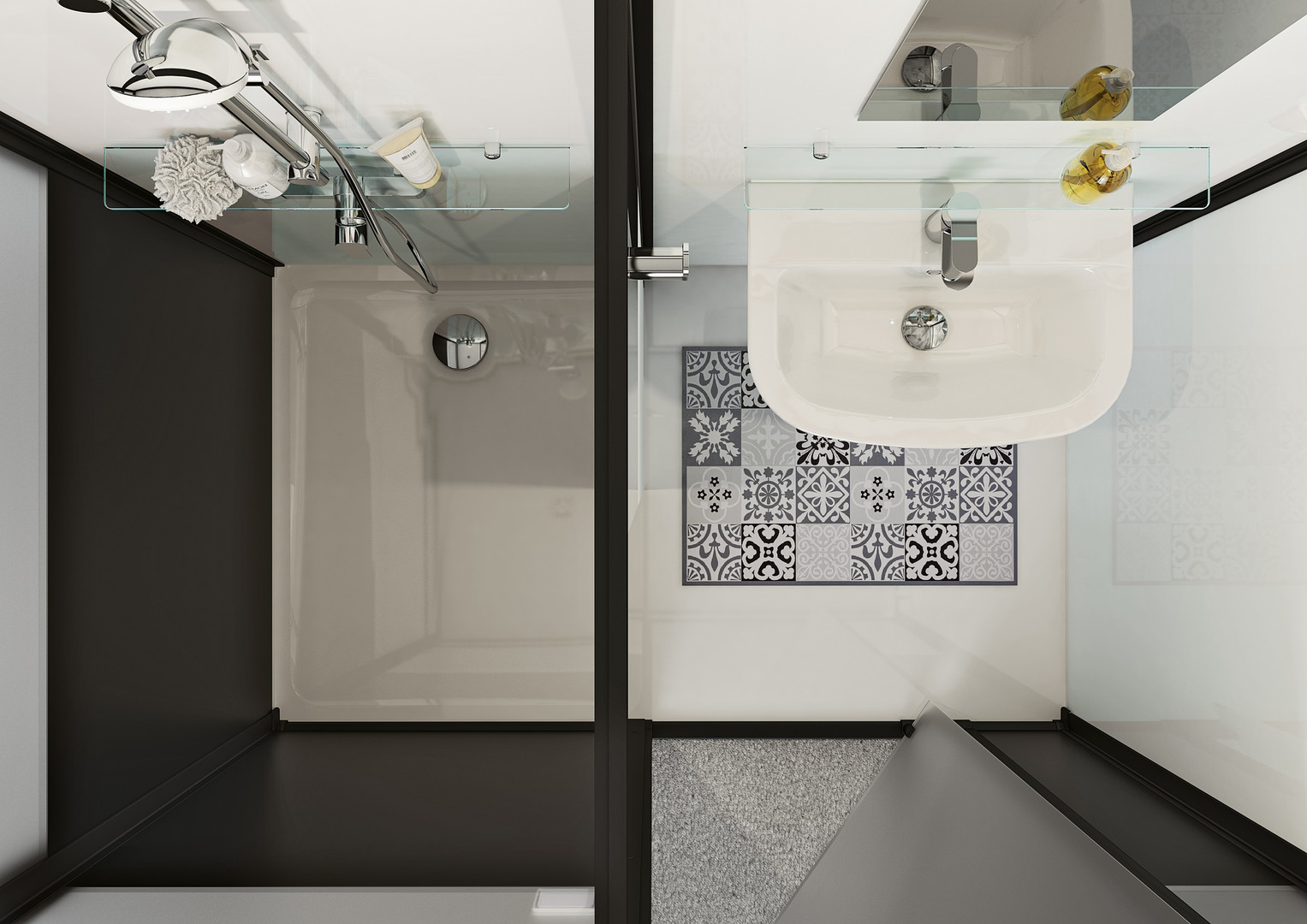 SFA Kinedo Modulo Standard 170x100 Komplettbadsystem rechte Nischenausführung Dusche & Waschtisch Grohe Einhandhebelmischer offener Duschbereich m. Vorhangstange Spiegel Glasablagen LED Einbaustrahler Gäser weiss-schwarz m. Abwasserpumpe Höhe230-250cm