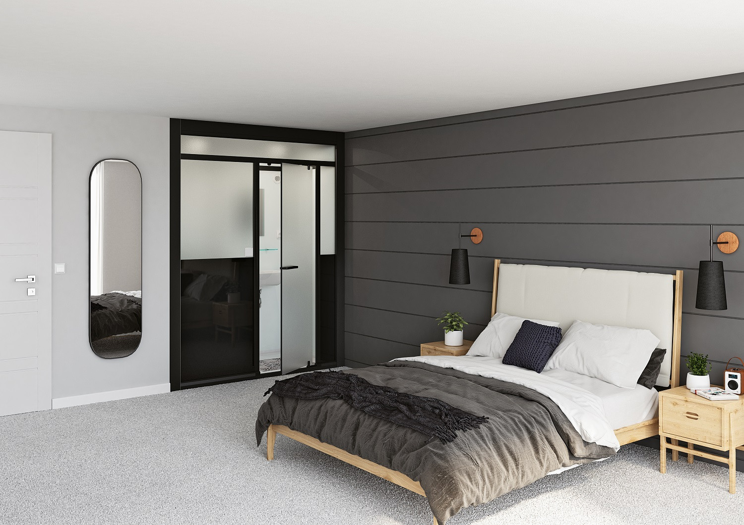 SFA Kinedo Modulo Standard 170x100 Komplettbadsystem rechte Nischenausführung Dusche und Waschtisch Grohe Einhandhebelmischer offener Duschbereich mit Vorhangstange Spiegel Glasablagen LED Deckeneinbaustrahler Gäser schwarz ohne Abwasserpumpe Höhe216-248cm