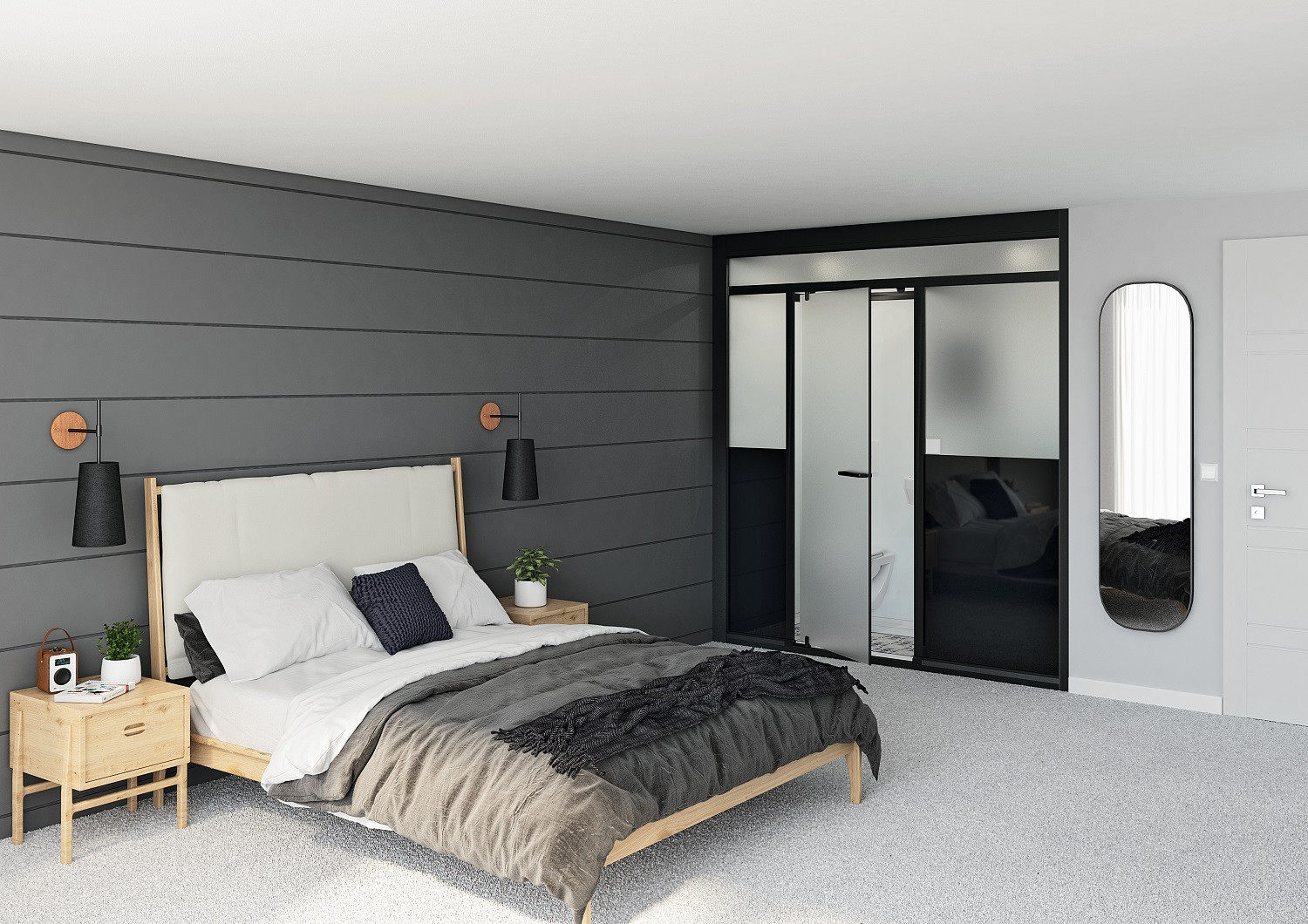 SFA Kinedo Modulo XL Luxus 200x100 Komplettbadsystem linke Eckausführung Wand-WC Dusche und Möbel WT Grohe Einhandhebelmischer Duschabtrennung elektr. Handtuch-HK Spiegel Glasablagen LED Deckeneinbaustrahler Gäser schwarz mit Kleinhebeanlage Höhe216-248cm