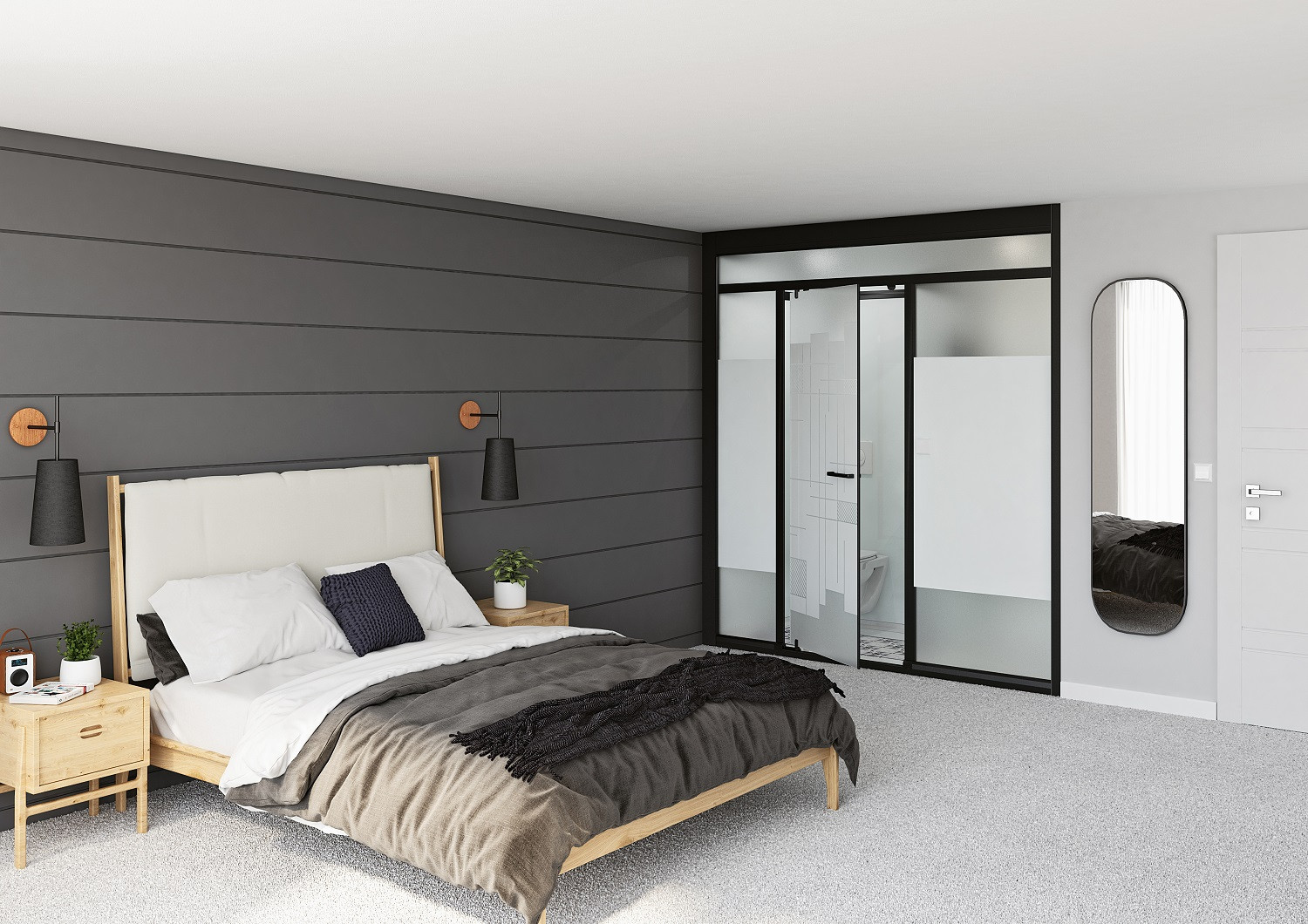 SFA Kinedo Modulo XL Standard 200x100 Komplettbadsystem linke Nischenausführung Wand-WC Dusche und Waschtisch Grohe Einhandhebelmischer offener Duschbereich Spiegel Glasablagen LED Deckeneinbaustrahler Gäser weiss-schwarz mit Kleinhebeanlage Höhe230-250cm