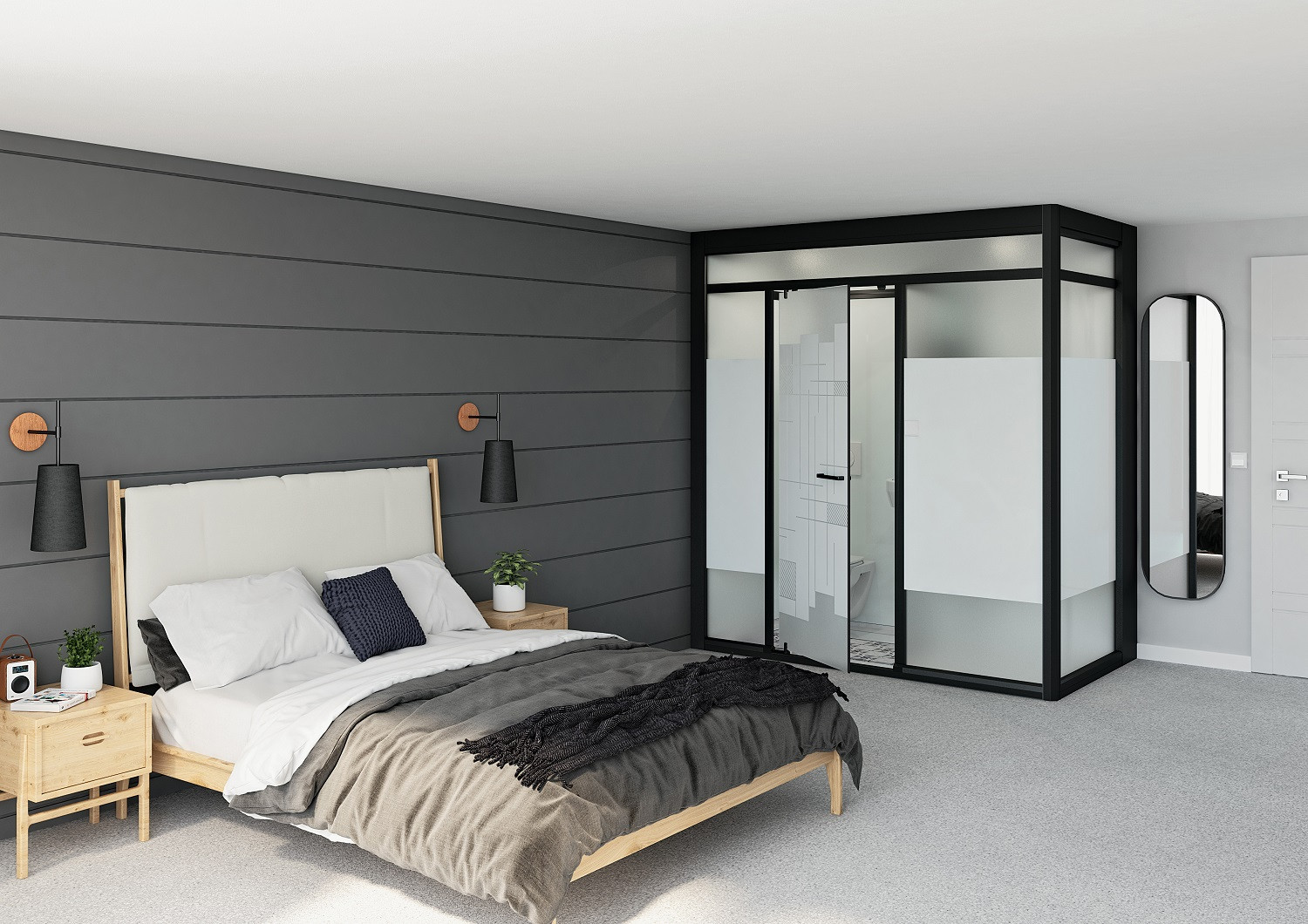 SFA Kinedo Modulo XL Standard 200x100 Komplettbadsystem linke Nischenausführung Wand-WC Dusche und Waschtisch Grohe Einhandhebelmischer offener Duschbereich Spiegel Glasablagen LED Deckeneinbaustrahler Gäser weiss-schwarz ohne Kleinhebeanlage Höhe230-250cm