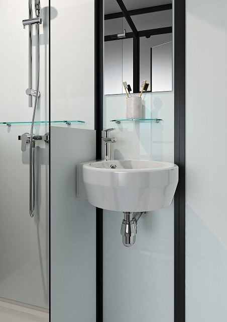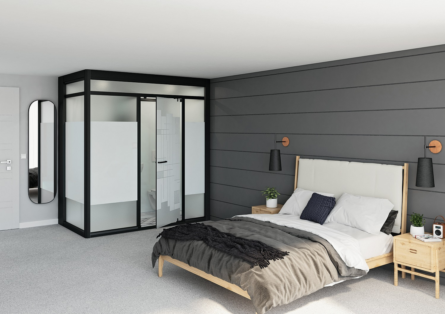 SFA Kinedo Modulo XL Standard 200x100 Komplettbadsystem rechte Eckausführung Wand-WC Dusche und Waschtisch Grohe Einhandhebelmischer offener Duschbereich Spiegel Glasablagen LED Deckeneinbaustrahler Gäser weiss-schwarz ohne Kleinhebeanlage Höhe230-250cm