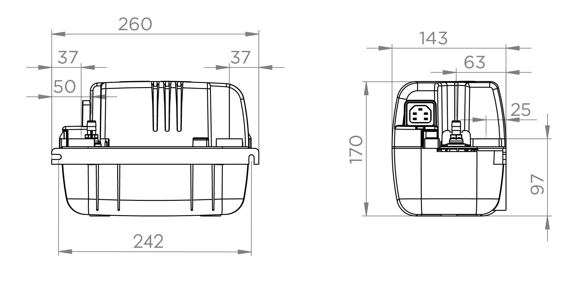 Kondensat aus Brennwertkesseln, Kälte- und Klimageräten oder Wärmepumpen, kompakt und geräuscharm, hohe Anwendersicherheit durch potentialfreien Alarmkontakt, Förderleistung 380 l/h, Einleitungsöffnung, 28 mm, Druckleitung Anschluss 10 mm, Behältervolumen 2 l, max. Wassereintrittstemperatur 35 °C, kurzzeitig bis 85°C, mindest-pH-Wert 2,5, max. Leistung der angeschlossenen Gastherme 50 kW, max. Leistung der angeschlossenen Öltherme 30 kW, Stromversorgung 220-240 V/50 Hz, elektrischer Anschluss Kabel mit Stecker 150 cm, Motorleistung 60 W, Schallpegel <45 db(A), max. Stromaufnahme 0,52 A, Schutzklasse IP 20, mit Rückschlagklappe, Befestigungsmaterial, 5 m Ablaufschlauch, Einlaufadapter, Netzkabel (1,5 m), Kabel für Alarmschaltung (1,5 m), 260 x 143 x 169 mm, 2,5 kg