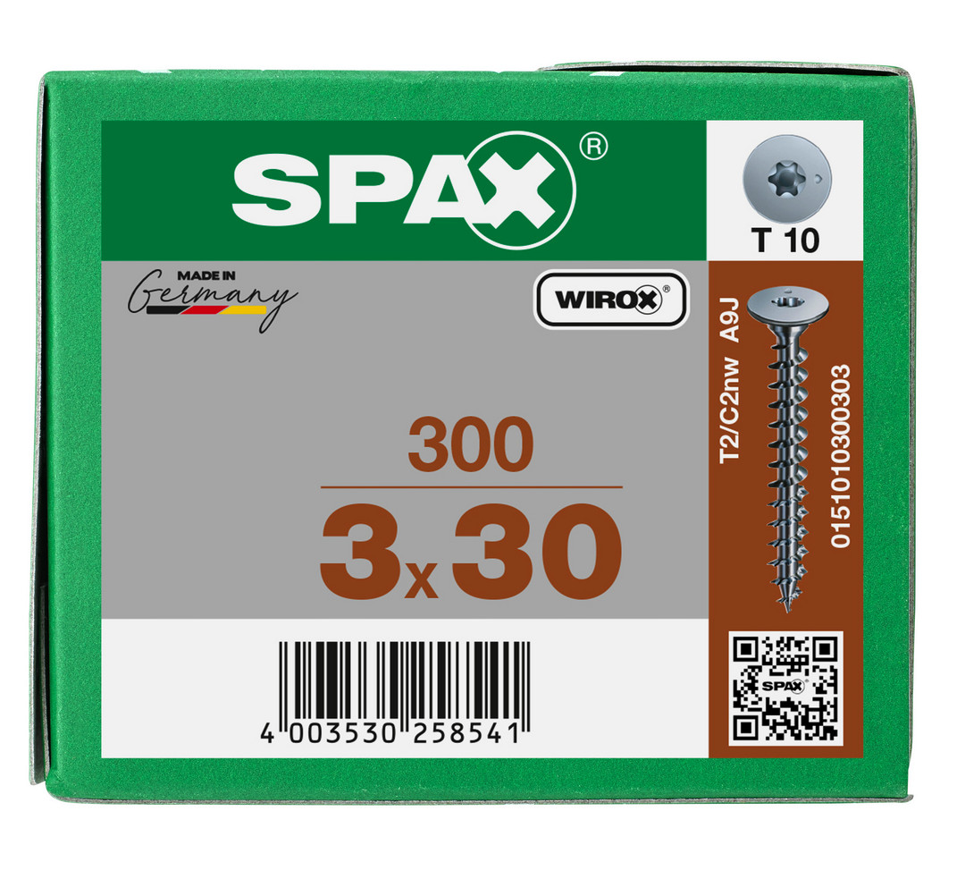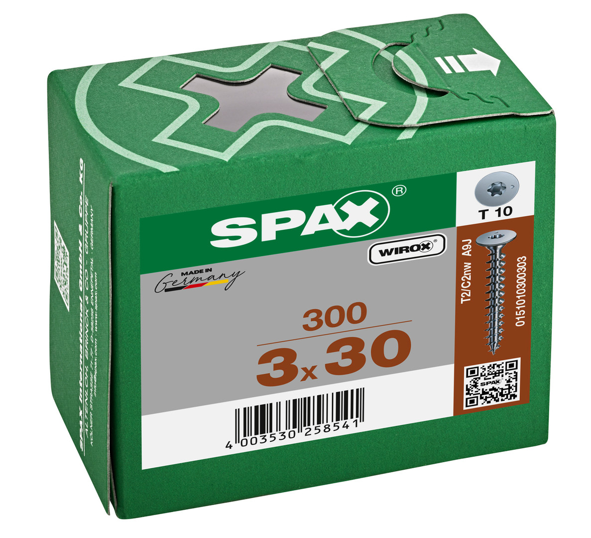 SPAX Flachrückwandkopf für Rückwände, 3,0 x 30 mm, 300 Stück, Vollgewinde, Rückwandkopf, T-STAR plus, 4CUT, WIROX - 0151010300303