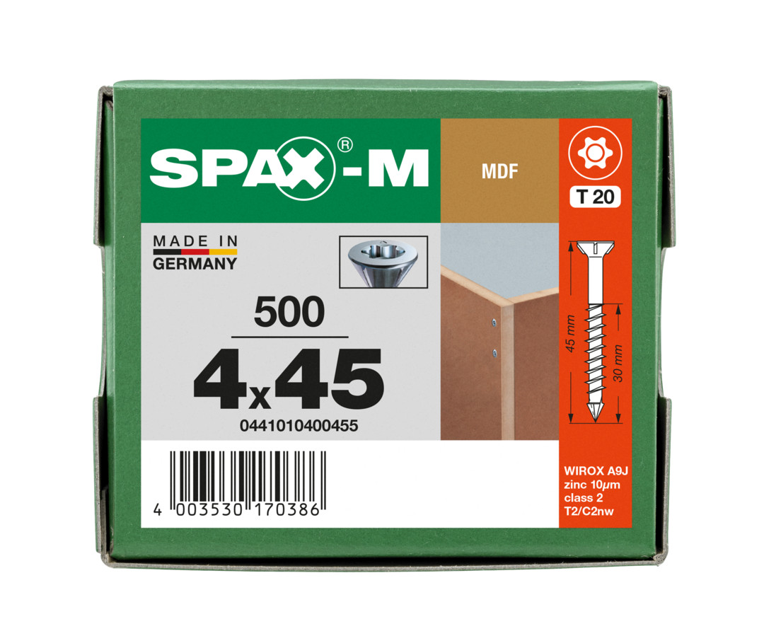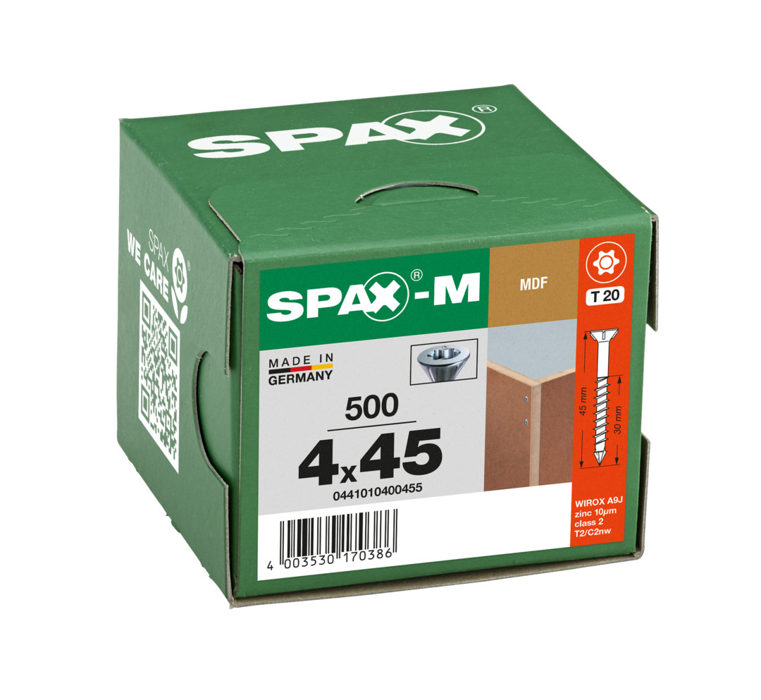 SPAX-M, 4,0 x 45 mm, 500 Stück, Teilgewinde, Senkkopf, T-STAR plus T20, CUT-Spitze, WIROX - 0441010400455 Der SPAX-typische Antrieb T-STAR plus ist ein sogenannter Innensechsrund. Durch diese Form vergrößert sich die Angriffsfläche bei unserem T-STAR plus, und die T-STAR plus-Bits sitzen optimal im Schraubenkopf. Die bestmögliche Kraftübertragung von Schrauber auf Schraube durch T-STAR plus ermöglicht ein zügiges Arbeiten, und das wesentlich effizienter als bei allen anderen Antrieben.