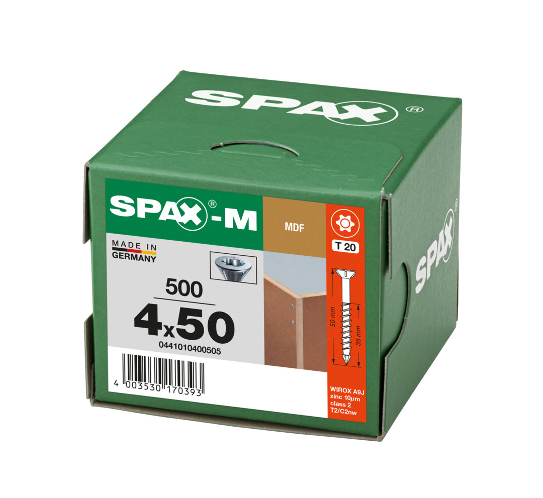 SPAX-M, 4,0 x 50 mm, 500 Stück, Teilgewinde, Senkkopf, T-STAR plus T20, CUT-Spitze, WIROX - 0441010400505 Der SPAX-typische Antrieb T-STAR plus ist ein sogenannter Innensechsrund. Durch diese Form vergrößert sich die Angriffsfläche bei unserem T-STAR plus, und die T-STAR plus-Bits sitzen optimal im Schraubenkopf. Die bestmögliche Kraftübertragung von Schrauber auf Schraube durch T-STAR plus ermöglicht ein zügiges Arbeiten, und das wesentlich effizienter als bei allen anderen Antrieben.