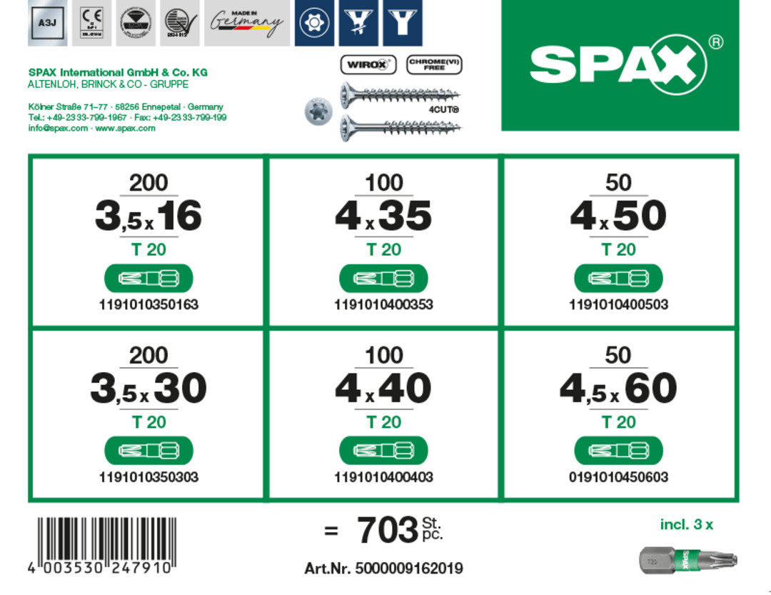 | Vorteil 5 | 703 Schrauben in verschiedenen Abmessungen, Senkkopf, T-STAR plus, WIROX, incl. 3 Bits T-STAR plus T20 |