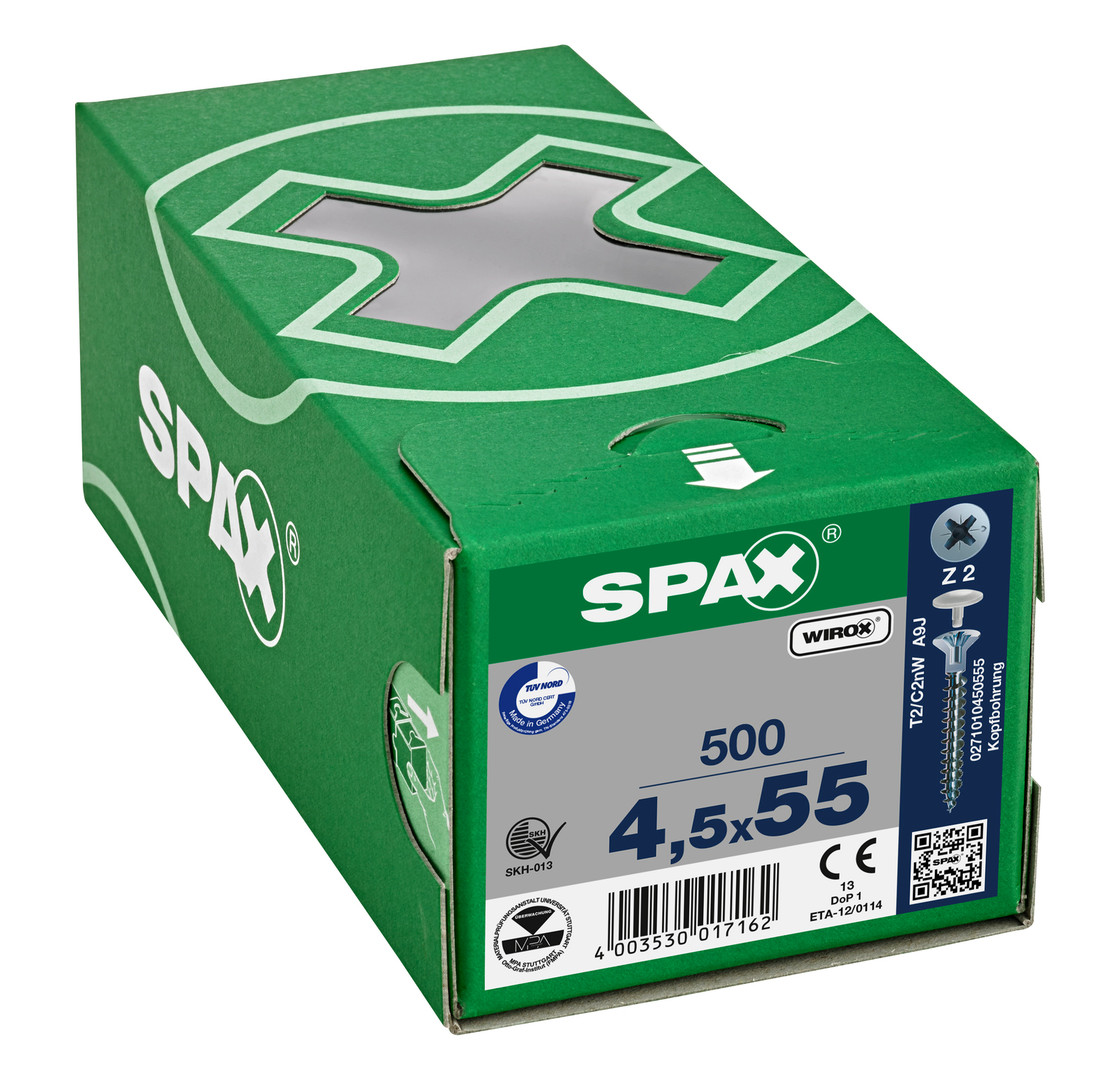SPAX Universalschraube mit Kopfbohrung, 4,5 x 55 mm, 500 Stück, Vollgewinde, Senkkopf, Kreuzschlitz Z2, S-Spitze, WIROX - 0271010450555