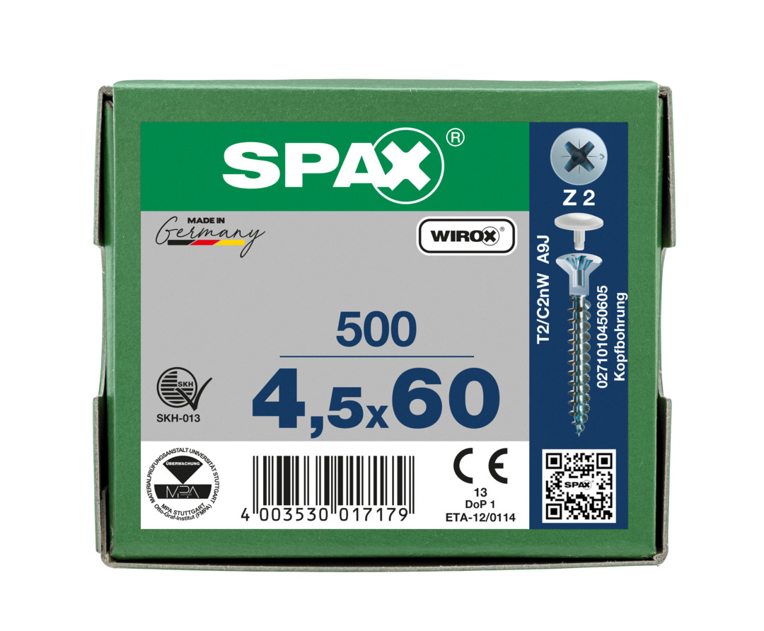 SPAX Universalschraube mit Kopfbohrung, 4,5 x 60 mm, 500 Stück, Vollgewinde, Senkkopf, Kreuzschlitz Z2, S-Spitze, WIROX - 0271010450605
