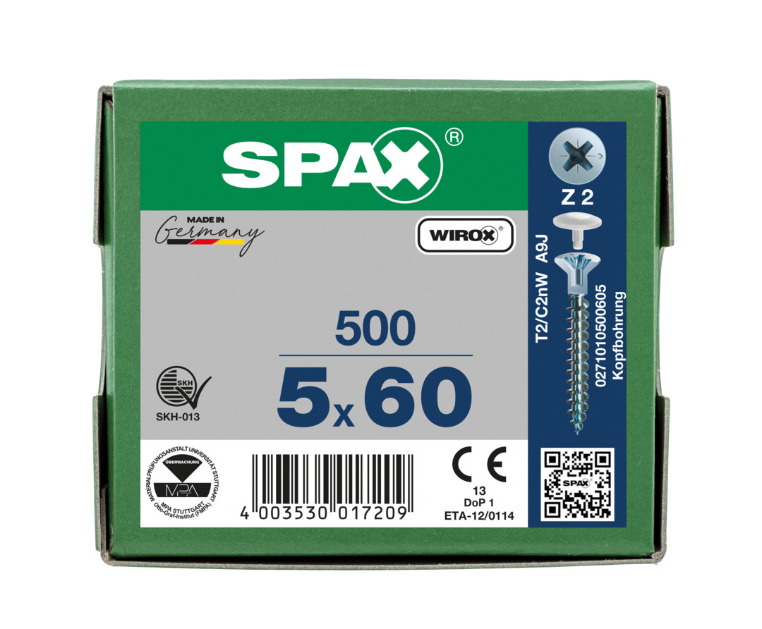 SPAX Universalschraube mit Kopfbohrung, 5 x 60 mm, 500 Stück, Vollgewinde, Senkkopf, Kreuzschlitz Z2, S-Spitze, WIROX - 0271010500605