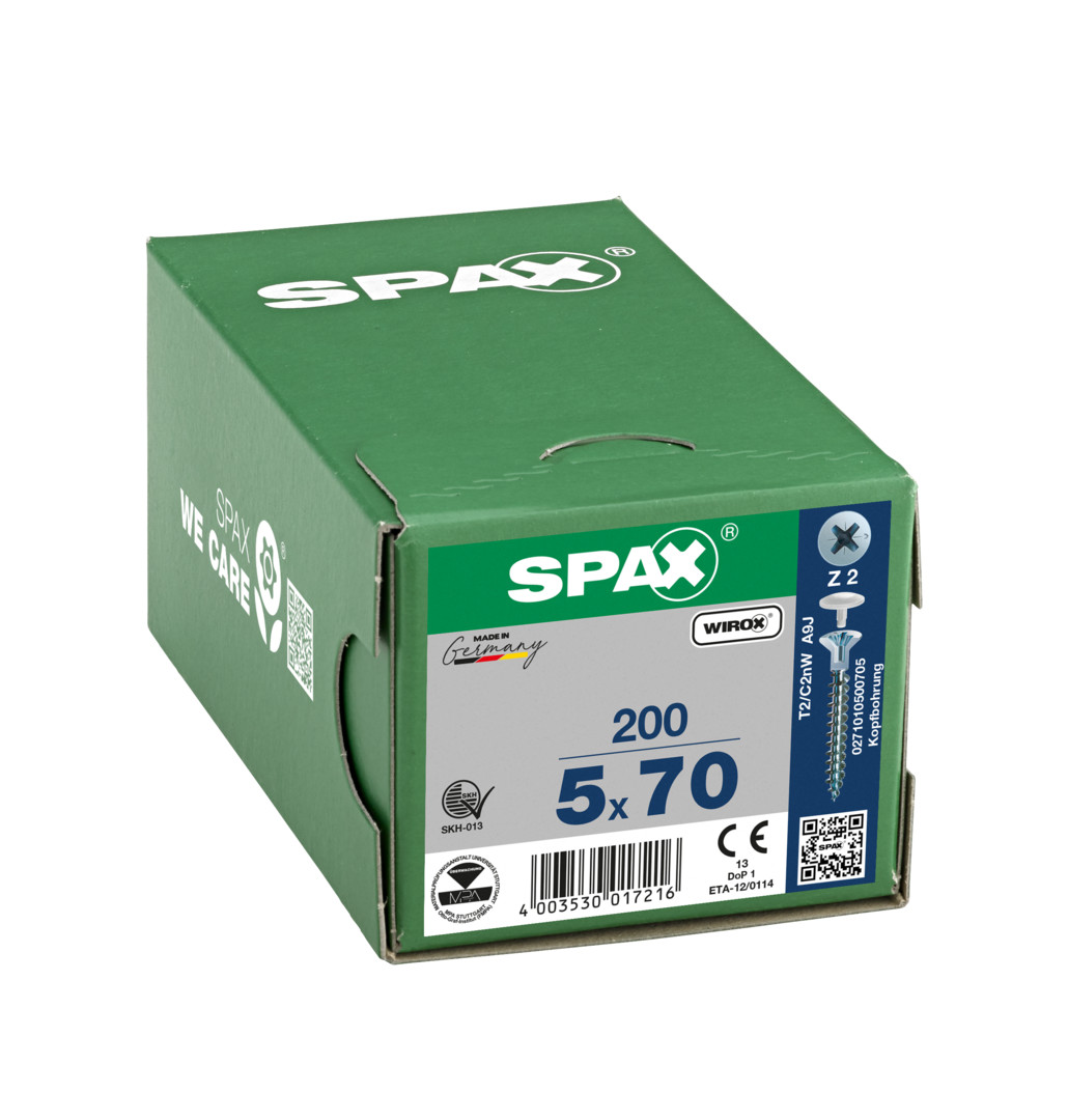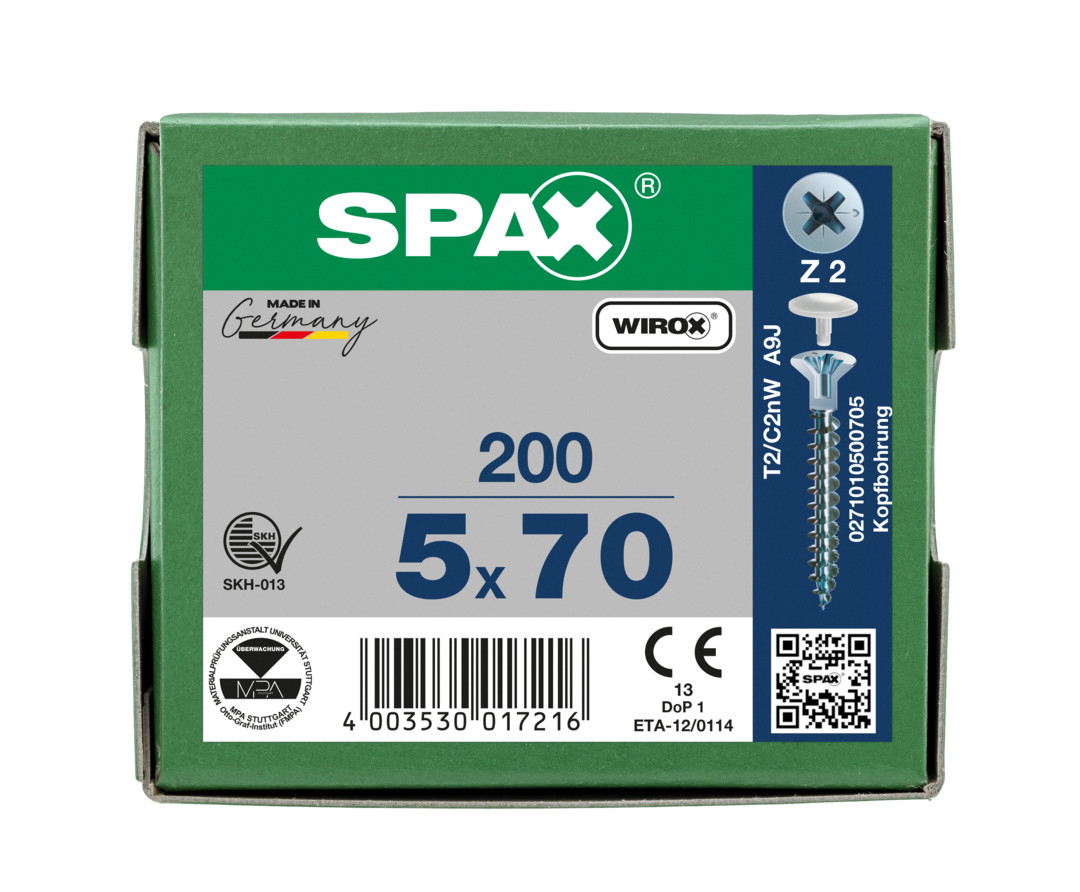 SPAX Universalschraube mit Kopfbohrung, 5 x 70 mm, 200 Stück, Vollgewinde, Senkkopf, Kreuzschlitz Z2, S-Spitze, WIROX - 0271010500705