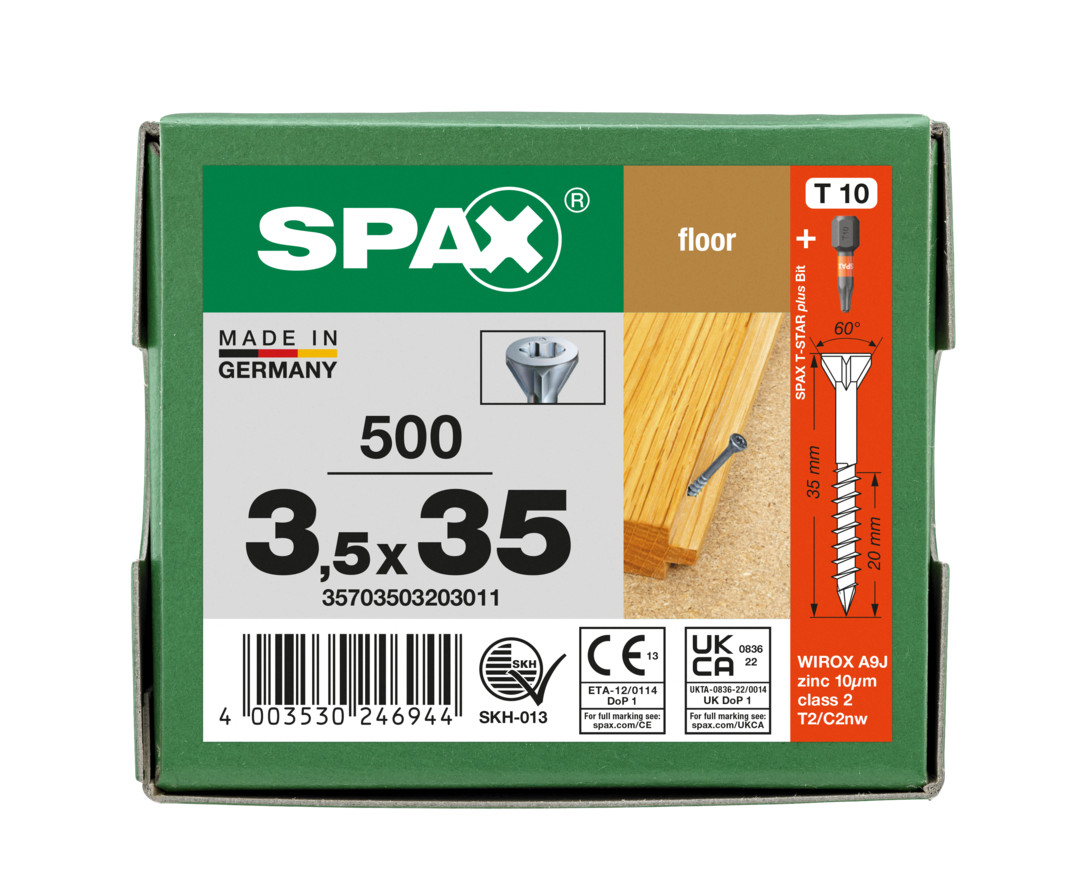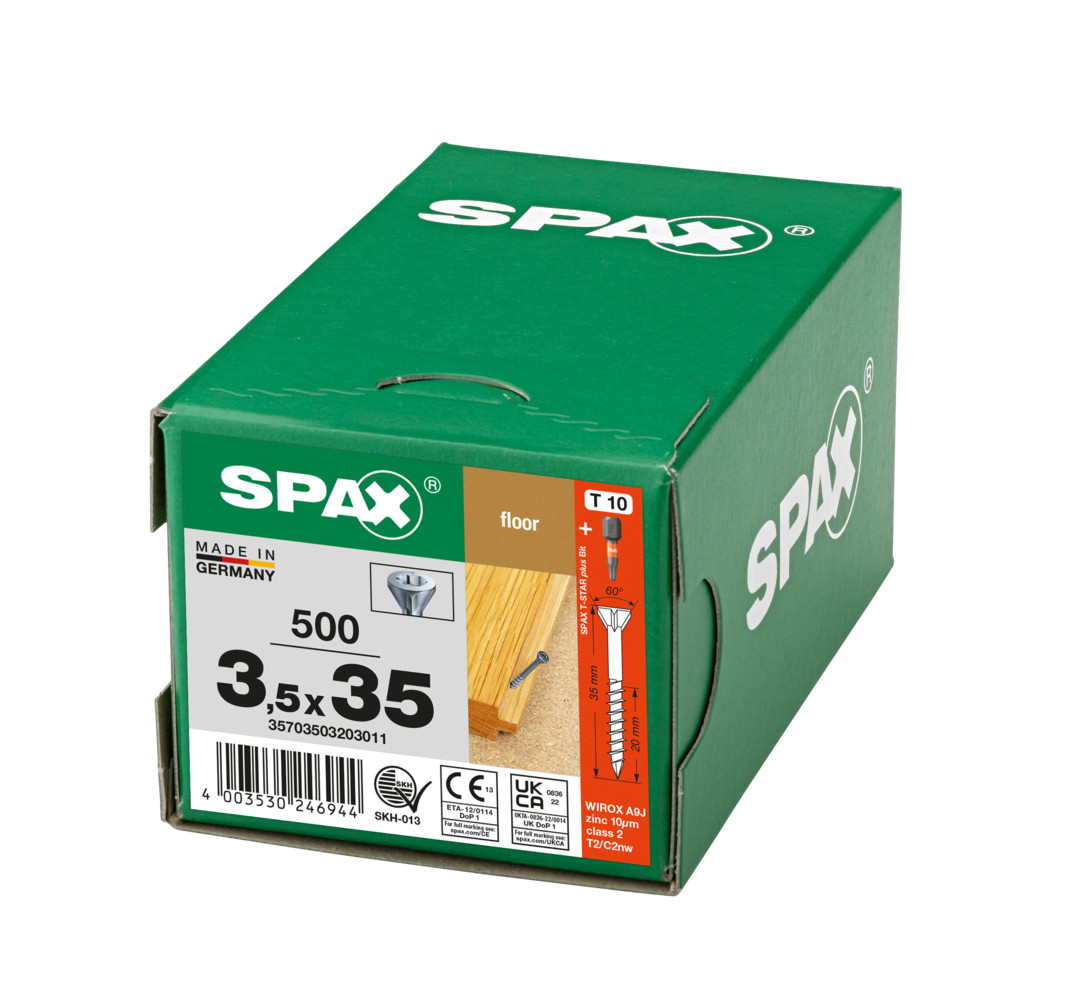 SPAX für Massivholz-Fußböden, 3,5 x 35 mm, 500 Stück, Teilgewinde, Senkkopf, T-STAR plus T10, CUT-Spitze, WIROX - 35703503203011