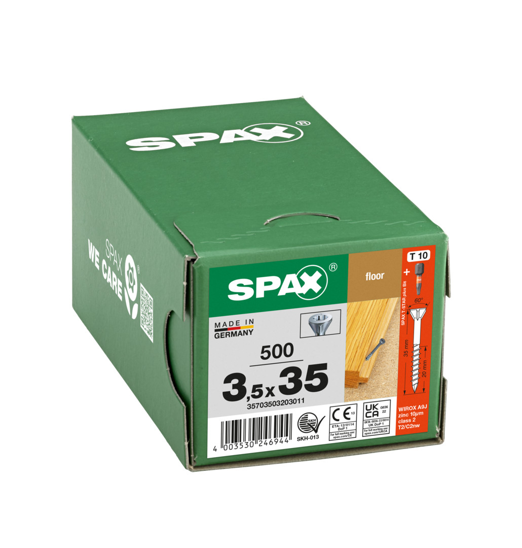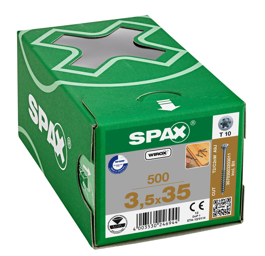 SPAX für Massivholz-Fußböden, 3,5 x 35 mm, 500 Stück, Teilgewinde, Senkkopf, T-STAR plus T10, CUT-Spitze, WIROX - 35703503203011 Der SPAX-typische Antrieb T-STAR plus ist ein sogenannter Innensechsrund. Durch diese Form vergrößert sich die Angriffsfläche bei unserem T-STAR plus, und die T-STAR plus-Bits sitzen optimal im Schraubenkopf. Die bestmögliche Kraftübertragung von Schrauber auf Schraube durch T-STAR plus ermöglicht ein zügiges Arbeiten, und das wesentlich effizienter als bei allen anderen Antrieben.