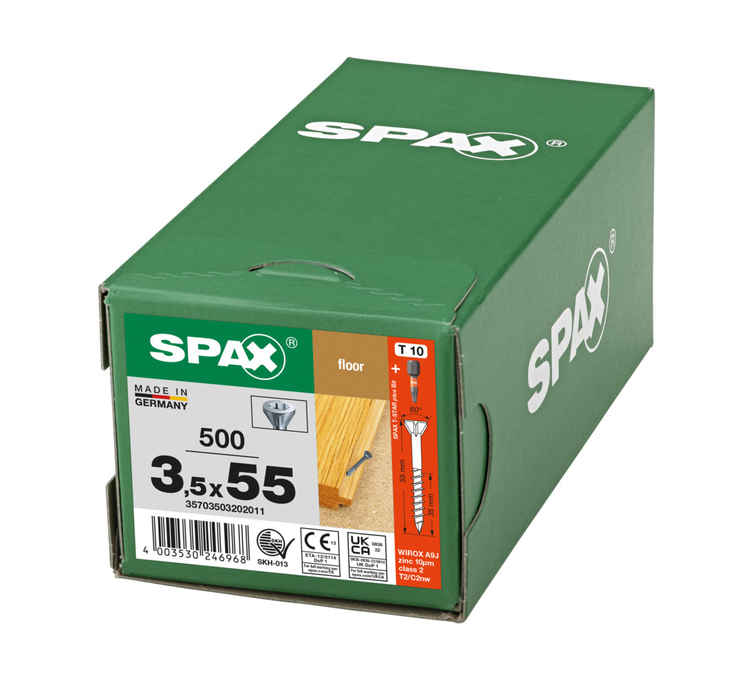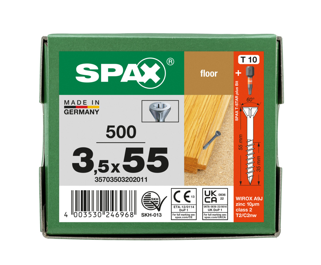 SPAX für Massivholz-Fußböden, 3,5 x 55 mm, 500 Stück, Teilgewinde, Senkkopf, T-STAR plus T10, CUT-Spitze, WIROX - 35703503202011