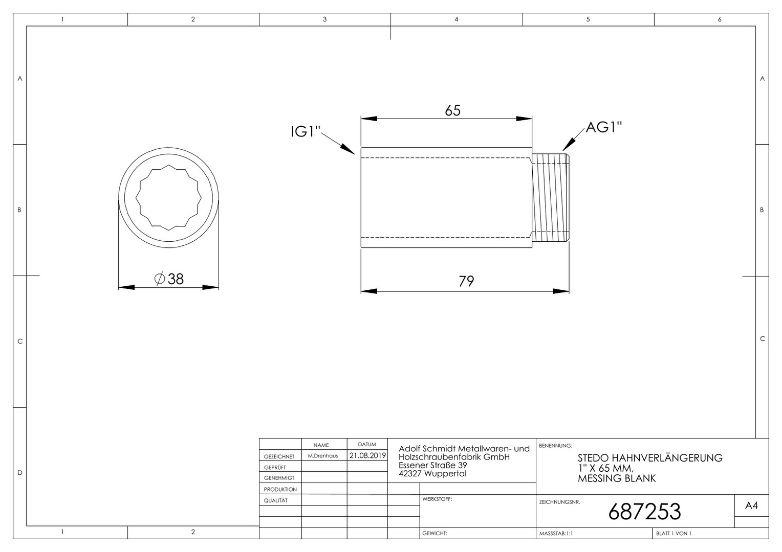 STEDO Hahnverlängerung 1" x 65 mm, CW617N mit Innenvielkant, Messing roh