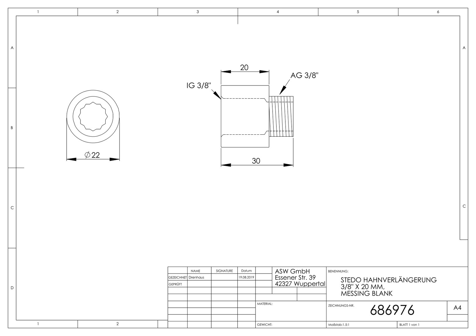 STEDO Hahnverlängerung 3/8" x 20 mm, CW617N mit Innenvielkant, Messing roh