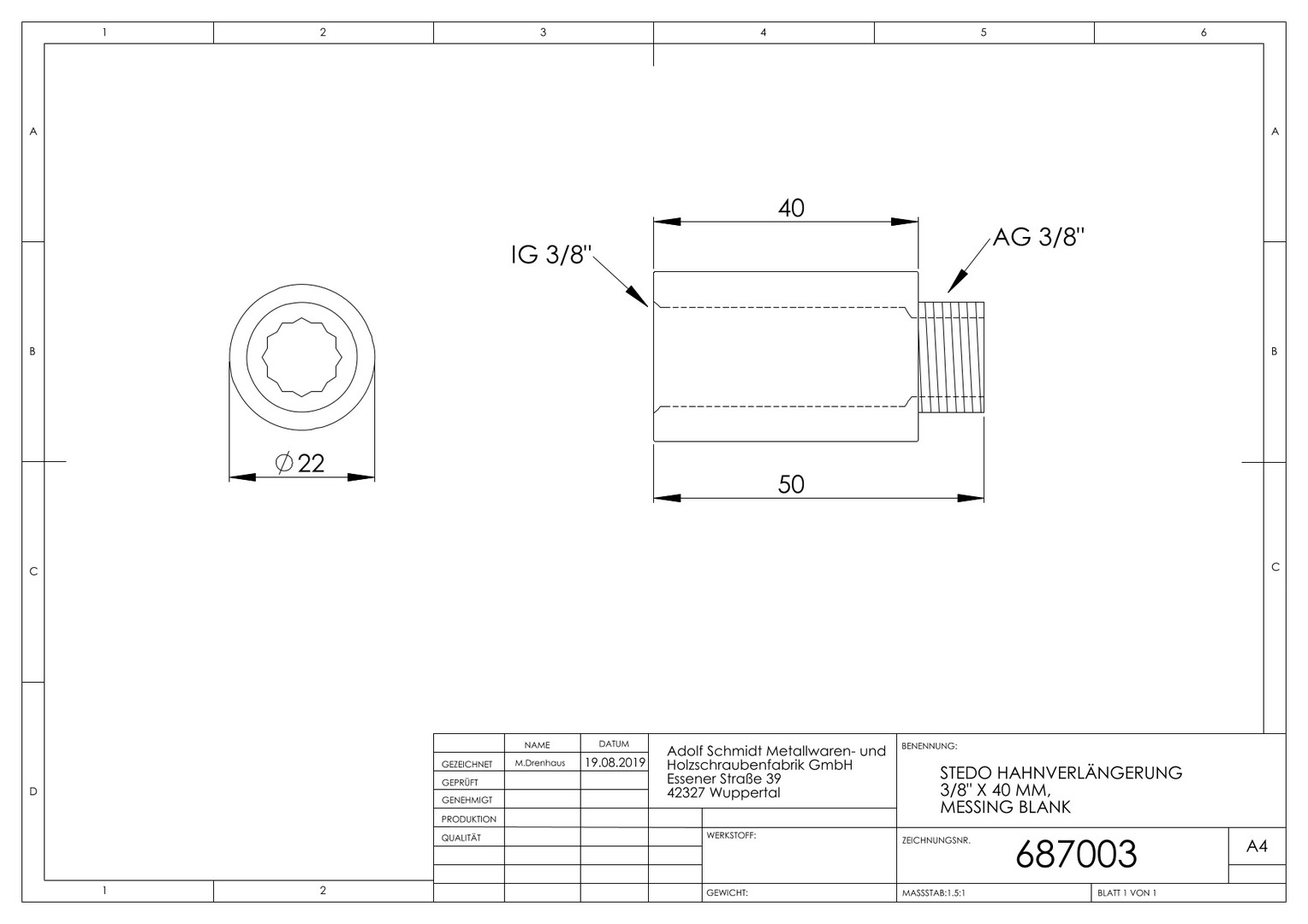 STEDO Hahnverlängerung 3/8" x 40 mm, CW617N mit Innenvielkant, Messing roh
