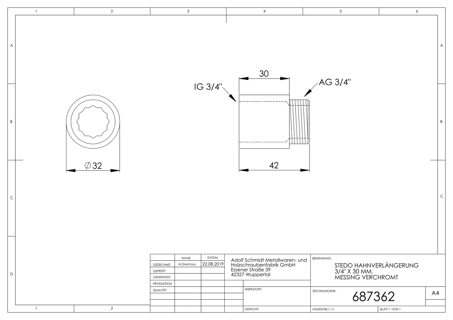STEDO Hahnverlängerung Messing verchromt, CW617N mit Innenvielkant, 3/4" x 30 mm