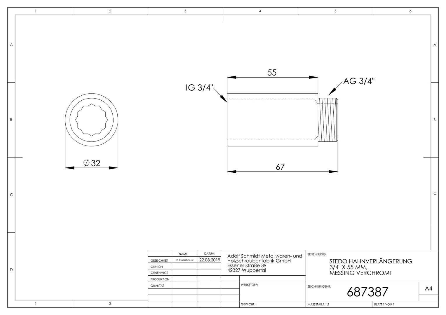 STEDO Hahnverlängerung Messing verchromt, CW617N mit Innenvielkant, 3/4" x 55 mm