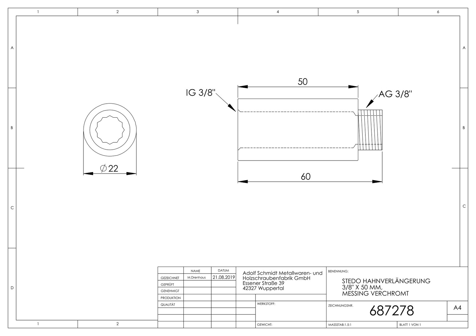 STEDO Hahnverlängerung Messing verchromt, CW617N mit Innenvielkant, 3/8" x 50 mm