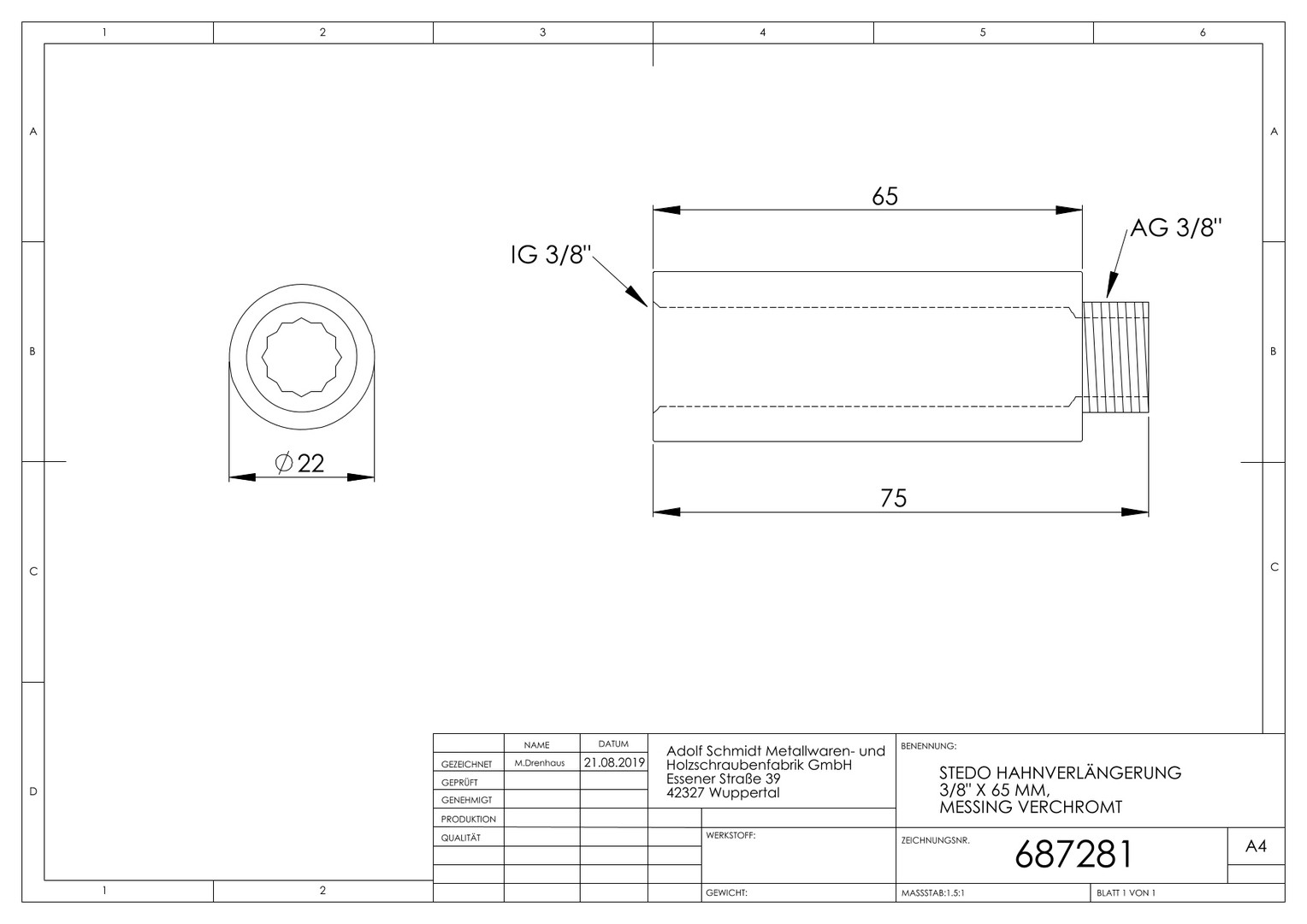 STEDO Hahnverlängerung Messing verchromt, CW617N mit Innenvielkant, 3/8" x 65 mm