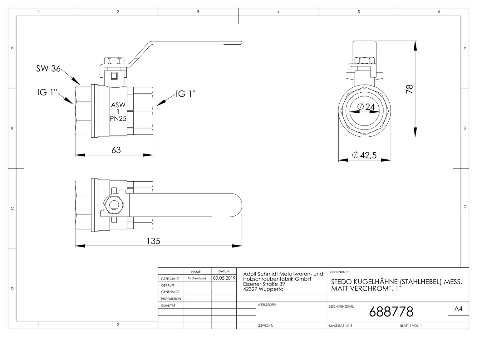 STEDO Kugelhahn Messing matt verchromt, BL 63 mm, IG 1" x IG 1"