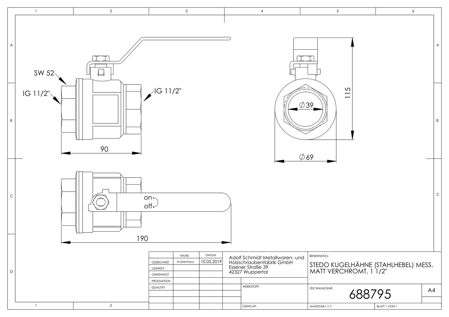 STEDO Kugelhahn Messing matt verchromt, BL 90 mm, IG 1 1/2" x IG 1 1/2"
