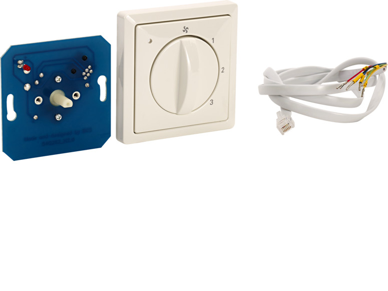 zum Einstellen der Lüfterstufen vom Wohnraum aus, kompatibel mit den zentralen Lüftungsgeräten 70 E/170 E Plus und 370 Plus mit Anschlusskabel ca. 1,5 m lang, die Montage erfolgt auf eine Unterputzschalterdose, Drehknebel aus Kunststoff