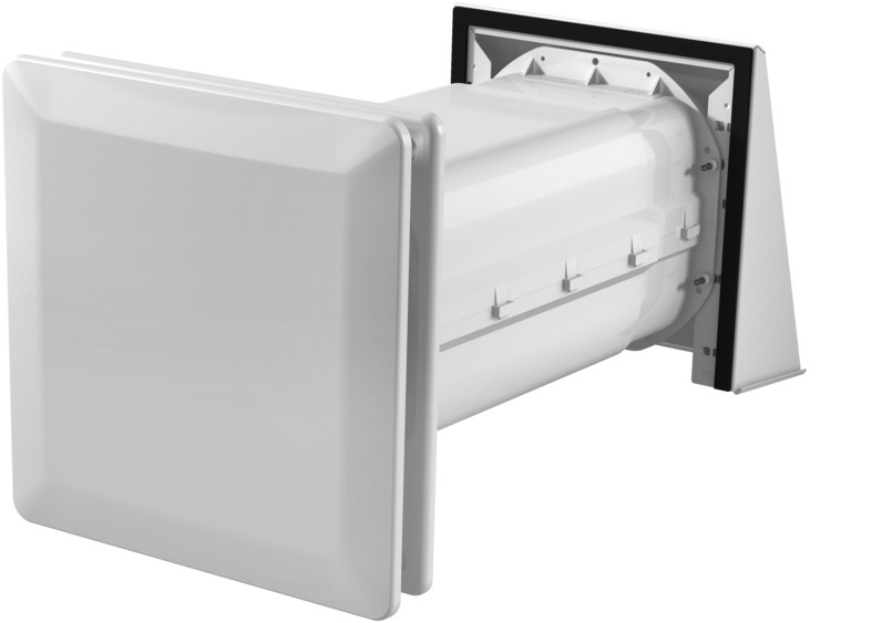 mit Wärmerückgewinnung, zur Be- und Entlüftung von Wohnungen und kleinen Gewerbeobjekten, mit separater Bedieneinheit, einsetzbar bis ca. 100 m² Wohnfläche, gegendruckstabiler Axiallüfter für den Einsatz auch in windexponierten Lagen, mit effizientem Wärmeübertrager aus Aluminium und schlagregendichter Außenblende, Filterwechsel über zu demontierende Lüftereinheit, Feinstaubfilter als Zubehör verfügbar, Außenblende aus Edelstahl pulverbeschichtet, Innenblende aus Kunststoff, EC-Lüfter sorgt für eine effiziente Betriebsweise, Einbau in runde oder quadratische Wanddurchbrüche, Netzanschluss auf der Innenseite der Ventilatoreinheit zugänglich, Einsatz von M5- oder F7-Feinstaubfiltern auf der Innenraumseite bei nur geringem Luftvolumenstromrückgang optional möglich, bis zu 8 Lüfter mit einer Steuereinheit kombinierbar, mit Teleskopgehäuse individuell auf Wandstärke einstellbar, 256 x 256 x 550 mm