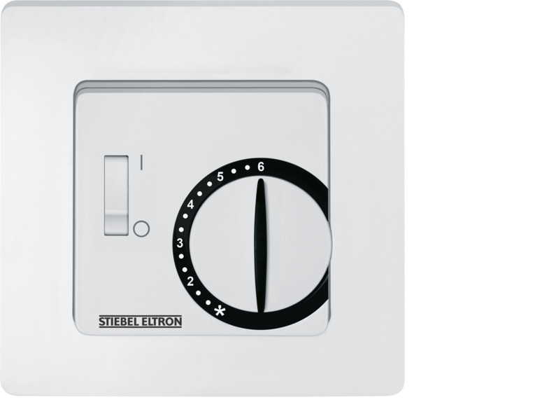 Ein-/Ausschalter, stufenlose Temperaturwahl über Drehwähler, reinweiß (RAL 9010), mit thermischer Rückführung, mit Wechselrahmen in vielen Flächenschalterprogrammen mit Norm-Innenmaß integrierbar, IP 30, 80 x 80 x 43 mm