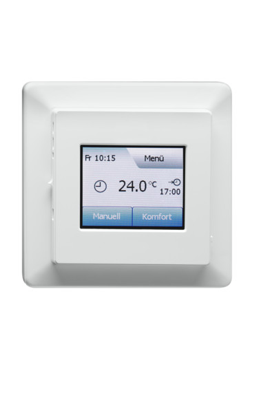 individuell definierbare Wochenprogramme, menügeführte Intervall-Programmierung, Wochenprogramm werkseitig voreingestellt, großes beleuchtetes Farb-Display, Anzeige der verschiedenen Betriebsfunktionen, Betriebsarten über Kurzwahltaste wählbar, selbstanpassende lernfähige Regelung (ermittelt automatisch die Vorheizzeit im Timerbetrieb), Begrenzung und Blockierung des Temperatureinstellbereiches möglich, Anzeige des Energieverbrauches für die vergangene Woche/Monat und Jahr, Fenster-offen-Erkennung, Resetfunktion, IP 21, 230 V, 84 x 84 x 40 mm