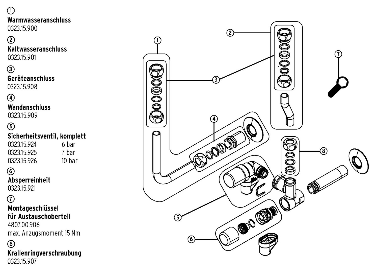 für den Anschluss an geschlossene/elektrisch beheizte Trinkwassererwärmer, Wandmontage, Gehäuse aus Pressmessing, bestehend aus einem Absperrventil und einem Membran-Sicherheitsventil, für TWE bis zu 10 l Inhalt, Ausgangsdruck regelbar von 1,5 bis 6 bar, werksseitig voreingestellt auf 4 bar, max. Eingangsdruck 10 bar nach DIN EN 1488, max. Betriebsdruck 80 % des Ansprechdrucks des Sicherheitsventils, max. Betriebstemperatur 30 °C