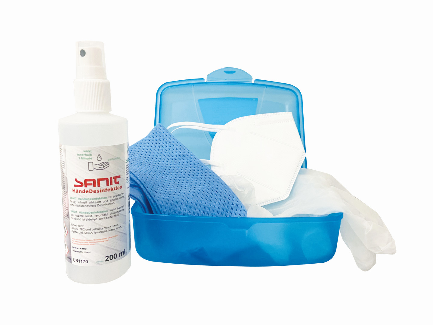 beinhaltet 1x Händedesinfektion 200 ml (in nachfüllbarer Flasche), 1x Mund- und Nasenschutzmaske, 1 Paar Viny-Einmalhandschuhe, 2x Reinigungstuch