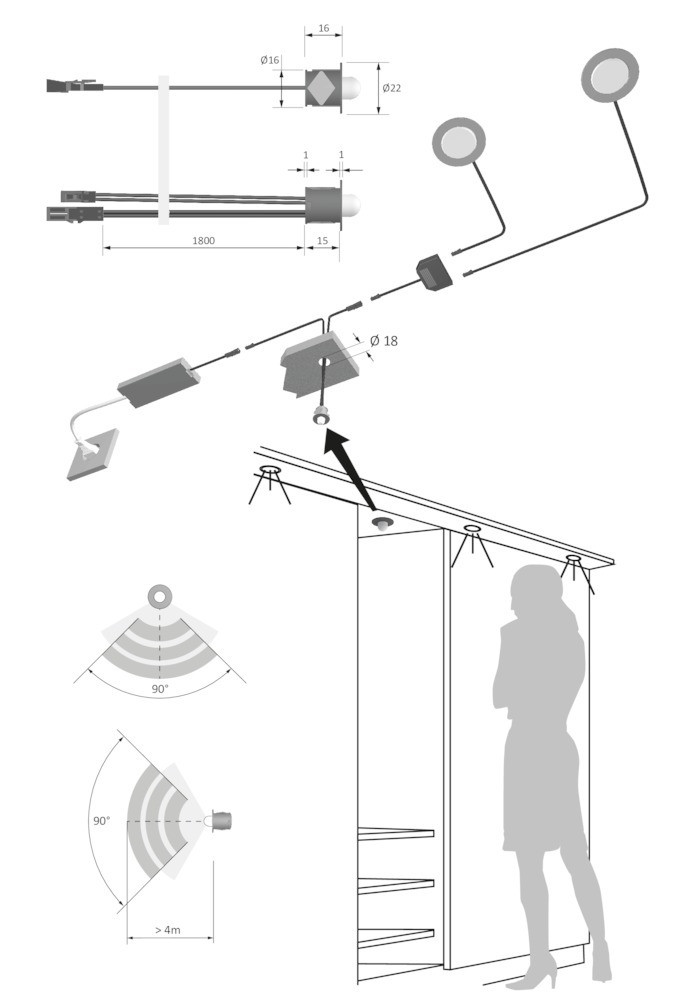 FORMAT PIR-Sensor; Reichweite: 4m; Funktion: Bewegungsmelder; Einsatzbereich: Schaltsystem; Höhe: 16mm; Durchmesser: 22mm; Länge Sensorleitung: 1.800mm; Nachlaufzeit: 30s; Basis: PIR-Sensor; Erfassungswinkel: 90°