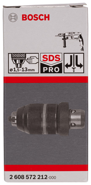 Das Schnellspannbohrfutter mit Adapter ist ein Bosch Systembohrfutter, das sich ohne zusätzliches Werkzeug anbringen und abnehmen lässt. Es spannt Bohrer (Durchmesser 1,5 bis 13 mm) mit minimalem Aufwand ein und erfordert keinen Schlüssel. Passend zu: GBH 2-24 DF. GBH 2-26 DFR. GBH 2-26 DFR + DMF 10 Zoom. GBH 2-28 DFV. GBH 3-28 DFR. GBH 4-32 DFR. GBH 18V-26 F. GBH 36.0 VF-LI. GBH 2600 Professional.
