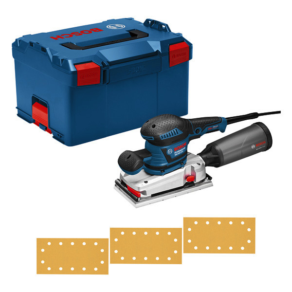 Schwingschleifer GSS 280 AVE, Der GSS 280 AVE Professional ist Boschs kabelgebundener Schwingschleifer in der 280-mm-Kategorie für Ergebnisse mit erstklassiger Oberflächengüte. Sein Gehäuse mit entkoppelter Schleifeinheit sorgt für konstanten Anpressdruck und perfekte Ergebnisse. Die einzigartige integrierte Vibrationsdämpfung sorgt für sehr geringe Vibrationen und gewährleistet Arbeiten ohne Unterbrechung. Die Schleifblätter lassen sich dank des Schleiftellers mit Klettverschluss und des Spannsystems einfach befestigen und sitzen perfekt. Der Schwingschleifer wurde zum Schleifen, Zwischenschleifen und Abschleifen von Rahmen sowie zum Feinschleifen konzipiert, und ist sowohl auf Holz, Furnier, Lack, Füllmasse als auch Mineral- und Acrylflächen einsetzbar. Das Gerät ist mit dem Bosch Click & Clean System kompatibel. Der GSS 280 AVE Professional verfügt außerdem über eine Staubbox mit integriertem Bosch Microfilter-System sowie eine Drehzahlvorwahl. L-BOXX 238 (1 600 A01 2G2). 1 x Schleifblatt C470, Best for Wood + Paint, 80 (separat erhältlich als 10er-Pack: 2 608 605 267). 1 x Schleifblatt C470, Best for Wood + Paint, 120 (separat erhältlich als 10er-Pack: 2 608 605 268). 1 x Schleifblatt C470, Best for Wood + Paint, 180 (separat erhältlich als 10er-Pack: 2 608 605 269). Zusatzhandgriff (2 602 026 175)