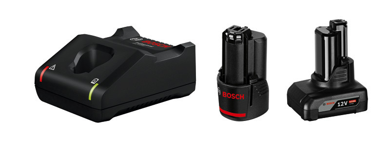 Starter-Set 1 x GBA 12V 2.0Ah + 1 x GBA 12V 4.0Ah + GAL 12V-40, Kombination aus kompaktem 12-Volt-Akku mit langer Laufzeit und schnellem Ladegerät, GBA 12V 2.0Ah als kompakter und leichter Akku und GBA 12V 4.0Ah bieten eine höhere Laufzeit für die komplette 12-Volt-Werkzeugpalette, GAL 12V-40: Hohe Ladegeschwindigkeit für alle 12-Volt-Akkus. Laden von 12-Volt-/2,0-Ah-Akku von 0 % auf 80 % in nur 24 Minuten, Kompatibel mit allen Bosch Professional 10,8V- & 12V-Werkzeugen (Professional 12V System), 1 x Akku GBA 12V 2.0Ah (1 600 Z00 02X). 1 x Akku GBA 12V 4.0Ah (1 600 Z00 02Y). Schnellladegerät GAL 12V-40 Professional (1 600 A01 9R3). Karton
