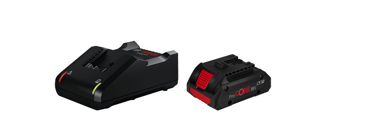 Starter-Set 1 x ProCORE18V 4.0Ah + GAL 18V-40, Dieses Starter-Set bietet die Leistung eines normalen 18-V-Akkus bei sehr kompakter, leichter Bauweise. Der ProCORE18V 4.0Ah ist mit unserer modernsten Zellentechnologie, den 21700-Zellen, ausgestattet. Daher ist dieser Akku kompakter und leichter als ein 18V 4.0Ah-Standardakku. Für eine längere Lebensdauer und Laufzeit ist dieser ProCORE18V-Akku mit unserer COOLPACK 2.0-Technologie für ausgezeichnetes Wärmemanagement ausgestattet. Das kompakte Ladegerät GAL 18V-40 lädt den ProCORE18V 4.0Ah-Akku in nur 48 Minuten bis zu 80 %. Kompatibel mit allen Werkzeugen und Ladegeräten aus dem Bosch Professional 18V System und der AMPShare Alliance. 1 x Akku ProCORE18V 4.0Ah (1 600 A01 6GB). Schnellladegerät GAL 18V-40 Professional (1 600 A01 9RJ). Karton