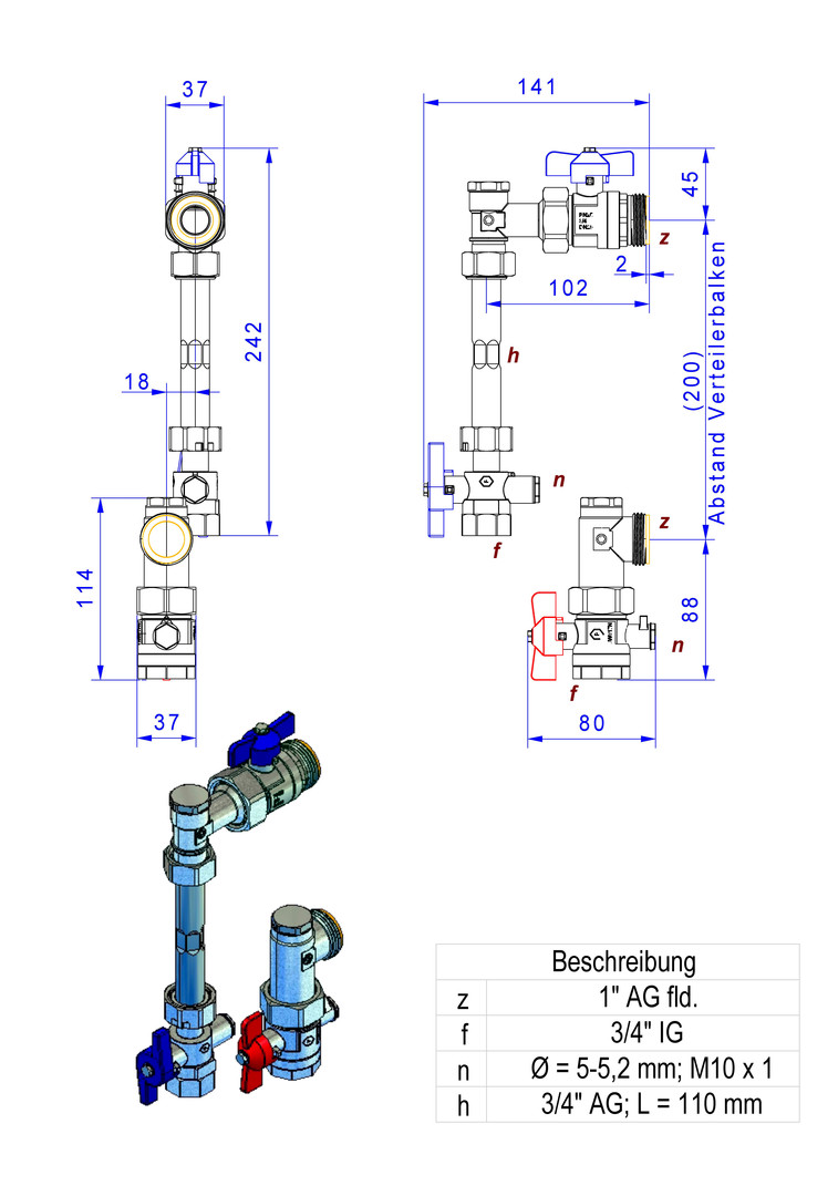 passend für e-class Heizkörper- und Flächenheizungs-Anschlussverteiler, mit Anschlussgarnitur mit Absperrkugelhähnen und Wärmezählereinbaustrecke, max. Betriebsdruck 6 bar, max. Betriebstemperatur 80 °C, Länge 232 mm, Kvs-Wert 3,7 qm/h, Primäranschluss G 3/4 IG