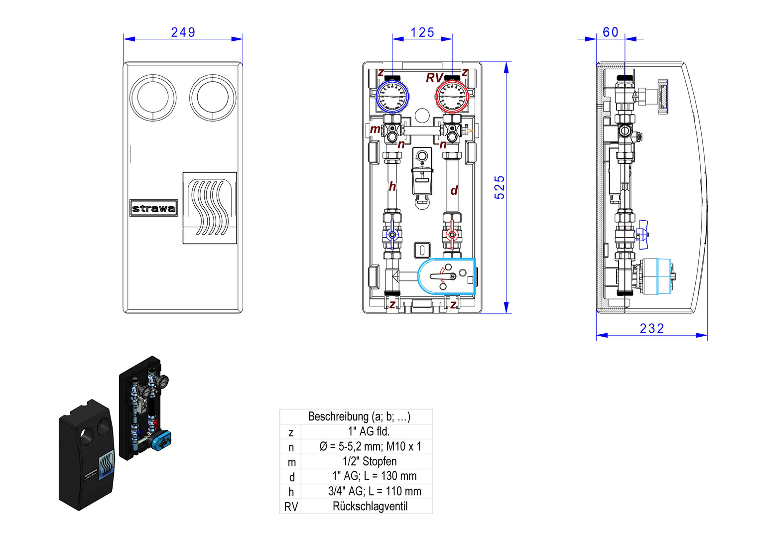 für festwertgeregelte Vorlauftemperaturregelung, passend auf strawi 125-25 Kesselverteiler, bestehend aus: Thermometer-Kugelhähnen DN 25 im Vor- und Rücklauf 0-120°C, zusätzliche Kugelhähne DN 25 im Vor- und Rücklauf (bei Wärmezählerverrohrung zusätzlicher Kugelhahn im Rücklauf), Rückschlagklappe im Vorlaufkugelhahn, mit oder ohne Wärmezählerverrohrung Länge 130 mm 2 x 1“ AG oder Länge 110 mm, 2 x 3/4“ AG und Fühlereinbaustücke 5-5,2mm M10x1 im Vor- und Rücklauf montiert, Pumpendistanzstück bzw. Pumpe, 3-Wege-Mischer DN 25 Kvs= 10,75, mit Festwert-Stellmotor 230 V/24V, Einstellbereiche Temperatur (Einstellung DIP-Schalter am Stellmotor Festwertregler): Voreinstellung 0-100 °C, andere mögliche Einstellbereiche (25-45 °C mit allen Pumpentypen möglich, 20-70 °C und 60-85 °C nur mit Grundfos Pumpen UPM3 Auto und Alpha 2 möglich, mitgelieferter STB entfällt), zusätzlicher regulierbarer Bypass im Mischer, beigelegter Sicherheitstemperaturbegrenzer (STB) auf 60°C eingestellt, mit EPP-Wärmedämmung, max. Volumenstrom 0,86 cbm/h (10 kW, bei Delta T= 10 K, max. Betriebstemperatur 100°C, max. Betriebsdruck 6 bar, Stutzenabstand 125 mm, 249 x 525 x 232 mm, Primäranschluss 1“AG flachdichtend, Sekundäranschluss 1“AG flachdichtend